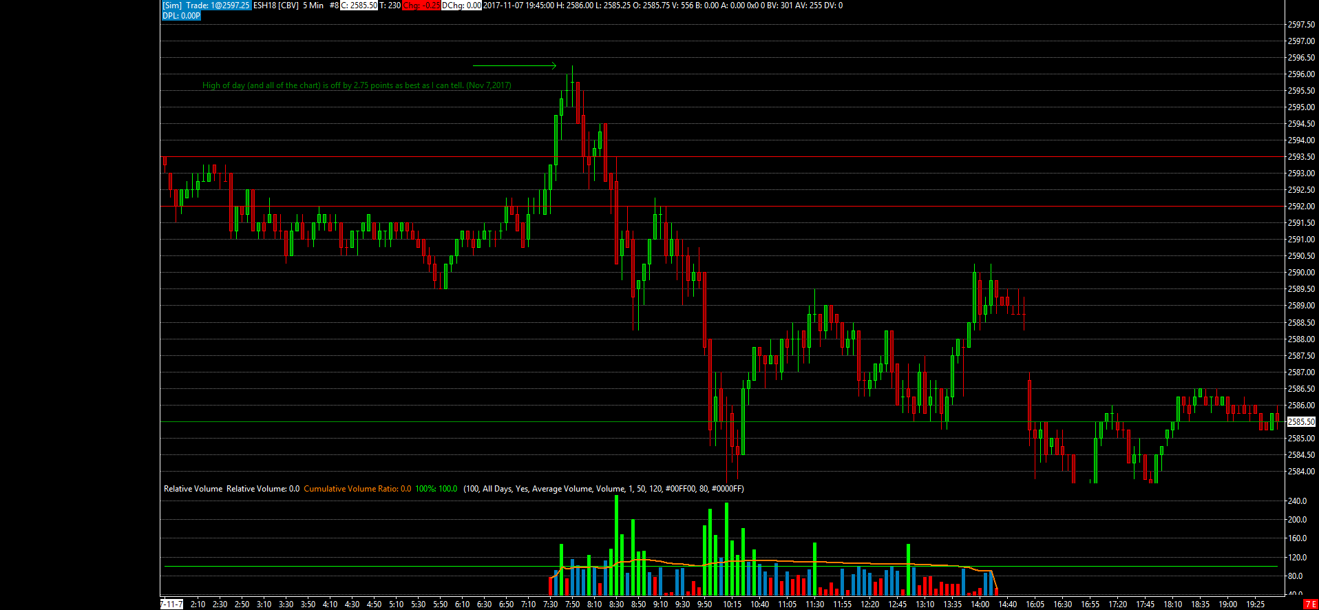 How to explain this. Basically the price action is off by 2.75. I belong to E-mini play and watch their daily videos.I draw in my zones and trade the day. At the moment I am practicing on November 2017. After the second day I noticed the price action was off by 2.75. I compare their high and low of day with what Sierra chart is telling me and both are off by the same amount. Obviously it is showing slicing through the zone and in reality it is not. At the bottom of the chart I am also showing relative volume. Is there a setting I have to change? (hope it is that easy) Thank you for your help. Kieth Anderson |