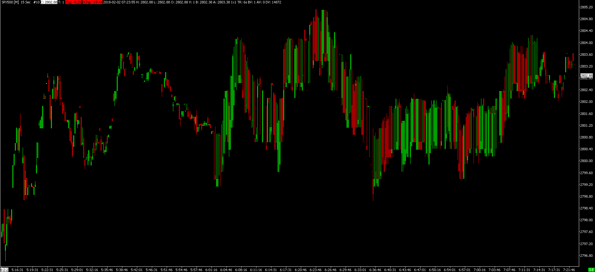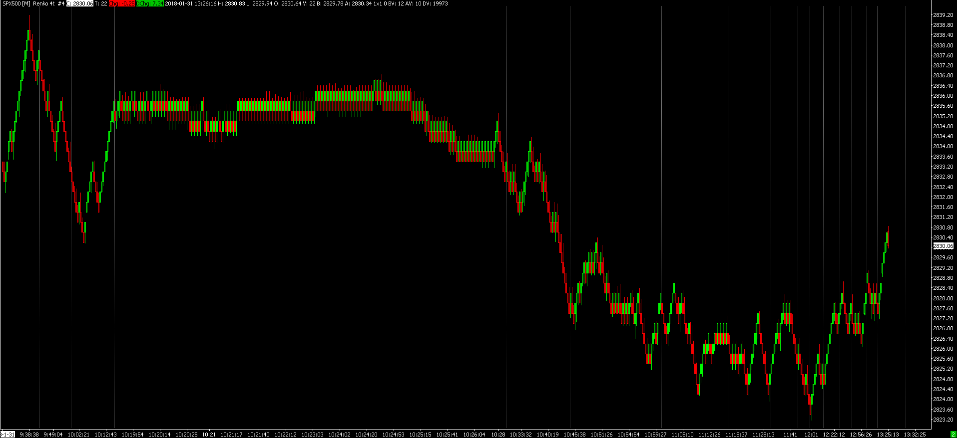 This has been resolved. Update Sierra Chart to the current version following the instructions here: Software Download: Fast Update We see nothing unusual with the SPX 500 data 2018-1-31. Provide an image of the chart or Trade DOM, by following these instructions: https://www.sierrachart.com/index.php?page=doc/PostingInformation.php#Image Sierra Chart Support - Engineering Level Your definitive source for support. Other responses are from users. Try to keep your questions brief and to the point. Be aware of support policy: https://www.sierrachart.com/index.php?l=PostingInformation.php#GeneralInformation For the most reliable, advanced, and zero cost futures order routing, *change* to the Teton service: Sierra Chart Teton Futures Order Routing |