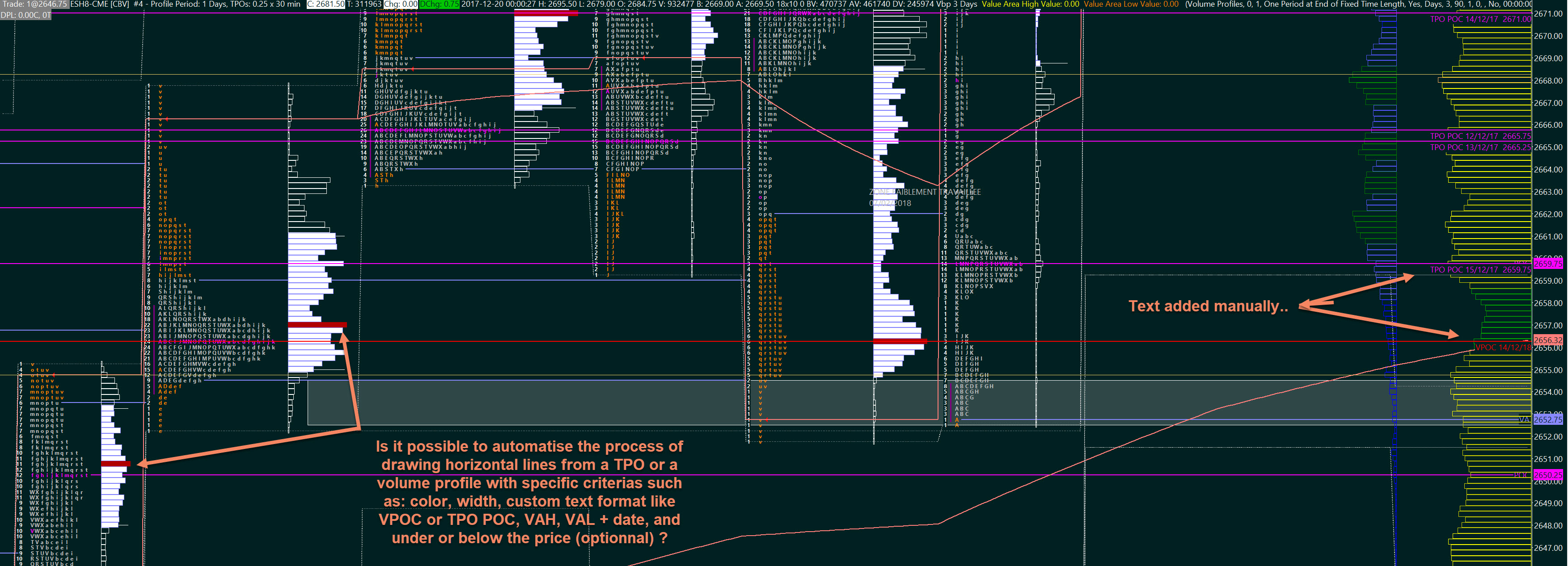 Sir, every day, I do place manually horizontal lines with specific information such as, VPOC, TPO POC with the date and the session (Europeano or US or Asian) Please see attached file. I do spend quite a bit of time to do that for each asset. Is it possible to automatise the process of drawing horizontal lines from a TPO or a volume profile with specific criterias such as: color, width, custom text format like VPOC or TPO POC, VAH, VAL + date, and under or below the price (optionnal) ? I know that it is possible to have the TPO POC drawn with a line, but there is not the date, a title or the price of it directly below or above the line. More clarity is always an edge. Besides, I would like to know if it possible to save a Study with all the levels that one has placed manually in order to import this study on a secondary instances or another pc, without having to reproduce them ? You will tell me, just import the whole charbook. But how do you do to import these levels on another chartbook ? It would be nice to enhance the platform with automatic possibilites. Thanks for your attention. |