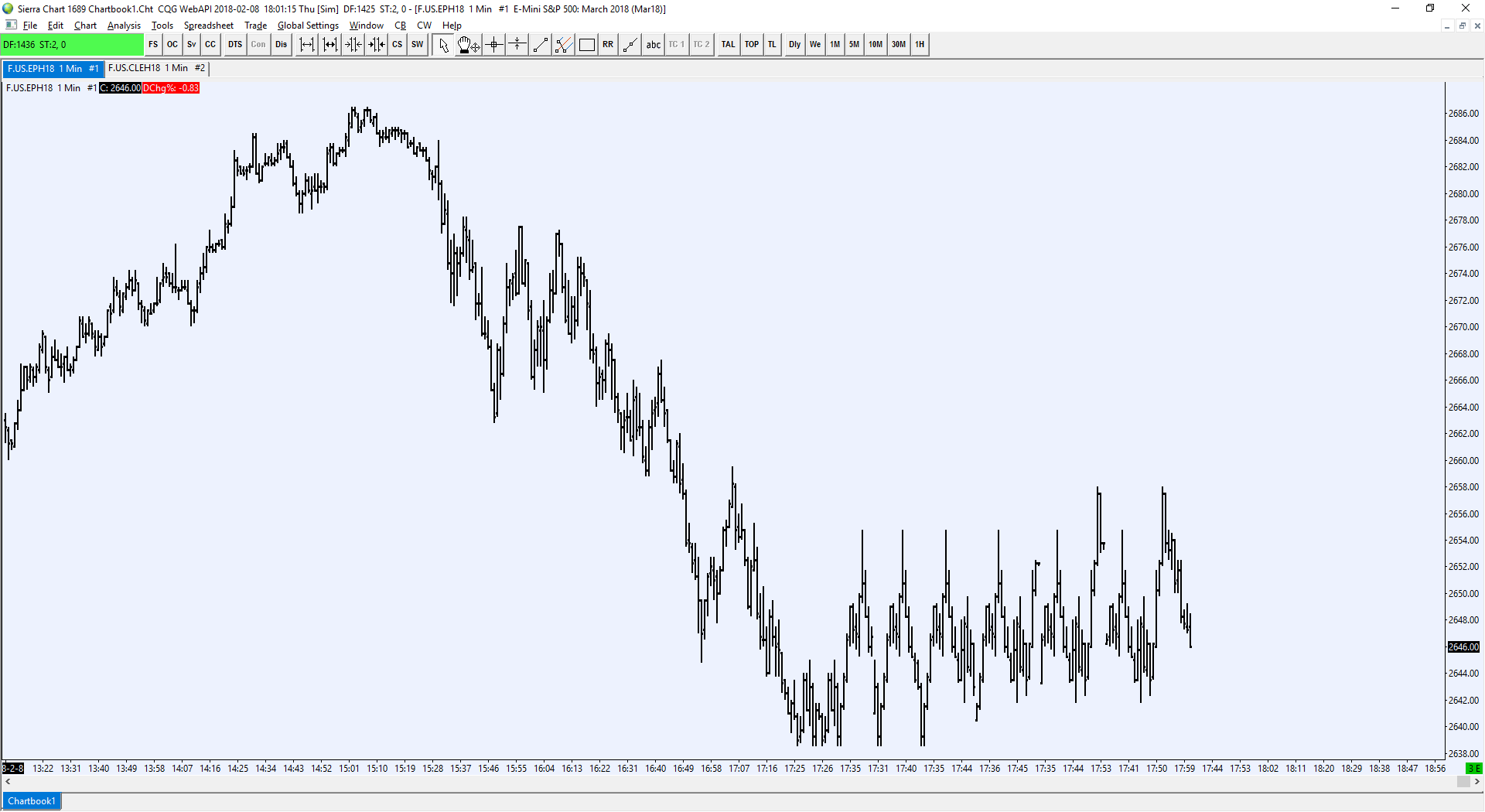 This looks like faulty timestamp data from CQG. Follow the instructions here to re-download that repetitive data at the end of the chart: Data Errors or Spikes in Charts, Flat or Flat Line Graph, Compressed Graph, Errors with Date/Time Values: 2.1.2 Deleting and Re-downloading Data. (Easier and Recommended Method) Sierra Chart Support - Engineering Level Your definitive source for support. Other responses are from users. Try to keep your questions brief and to the point. Be aware of support policy: https://www.sierrachart.com/index.php?l=PostingInformation.php#GeneralInformation For the most reliable, advanced, and zero cost futures order routing, *change* to the Teton service: Sierra Chart Teton Futures Order Routing Date Time Of Last Edit: 2018-02-08 22:31:18
