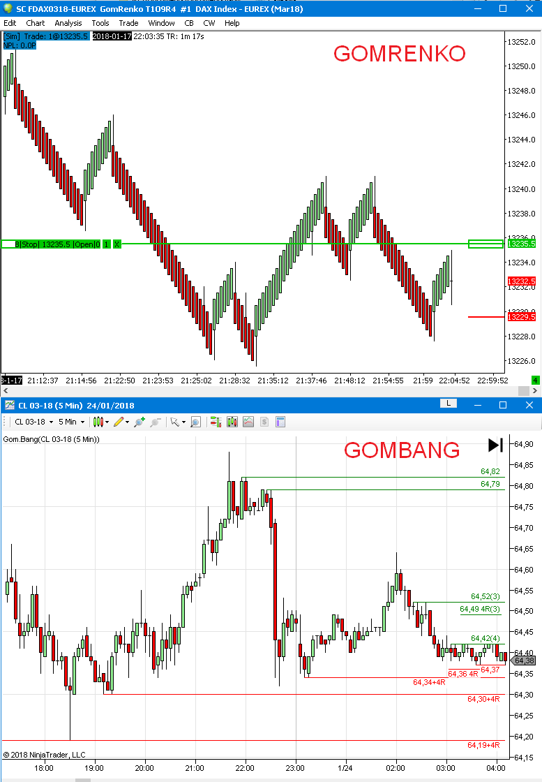Hi, It's my pleasure to announce the release of 2 new studies on https://www.gomicators.com 1. GomRenko : GomRenko is a UniRenko/Universal Renko implementation with added custom features *Variable tick size as % of the current price. Very useful on Bitmex/cryptocurrency charts *Ability to show price gaps (this info is lost with 'normal' Renko bars) *Different choices of altering Open and Close prices *Display prices at which the next Renko bar will start *Allow to enter stop orders on the chart with one click, including auto-trailing. * see https://www.gomicators.com/gomrenko-sierra-chart/ 2. GomBang : GomBang is intended for breakout traders, it is a MultiTop/MultiTimeFrame indicator. It will *Show double/multitop levels along with the number of touches *Show on a chart the multitop levels from other charts, allowing correlation and confluence from other time frames. * see https://www.gomicators.com/gom-bang/ A 14 days free trial is available for both studies. Date Time Of Last Edit: 2018-02-10 10:53:40