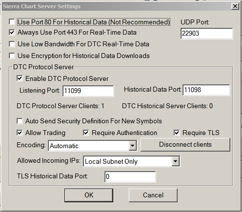 Hello Sierra Team I have two PCs running sierra charts. One acts as a DTC server and the other PC connects to it as a DTC Sub Instance. They have been running well until I updated to current version 1697. The problem is that on the client PC, after connecting to the server and opening an existing Chartbook, the historical data download fails giving me a message in red on the charts: Download Failed I have not made any changes to the Data/Trade service settings since they were working well. I have attached a copy on the server settings Thank you for looking into this |