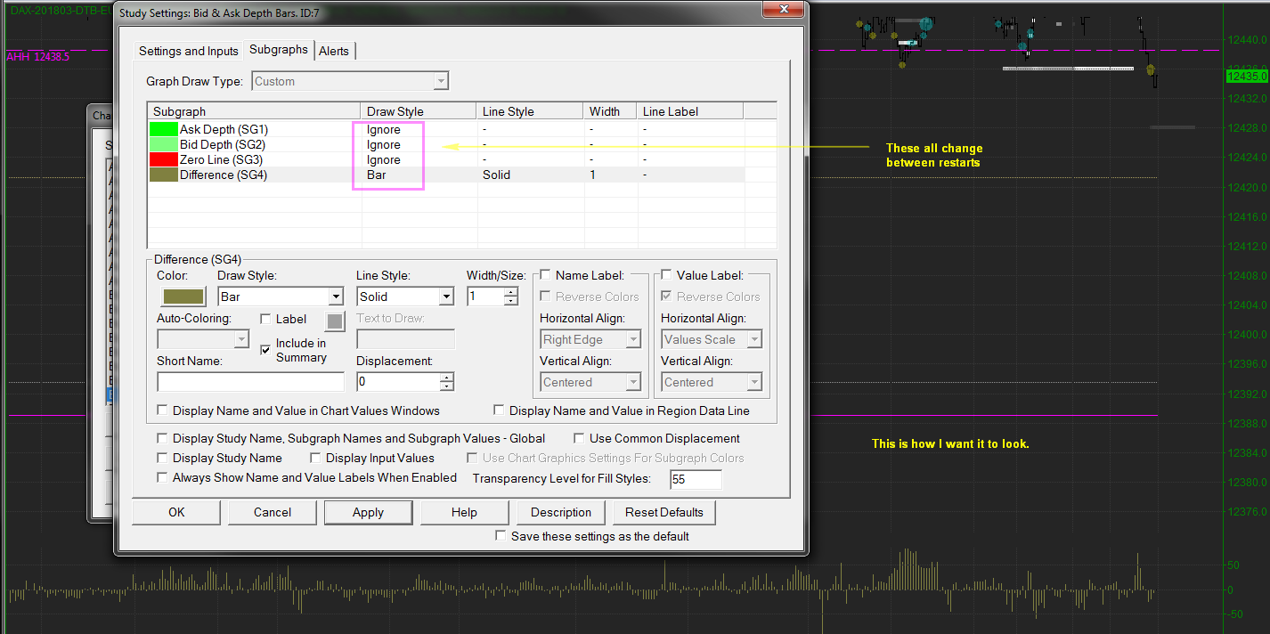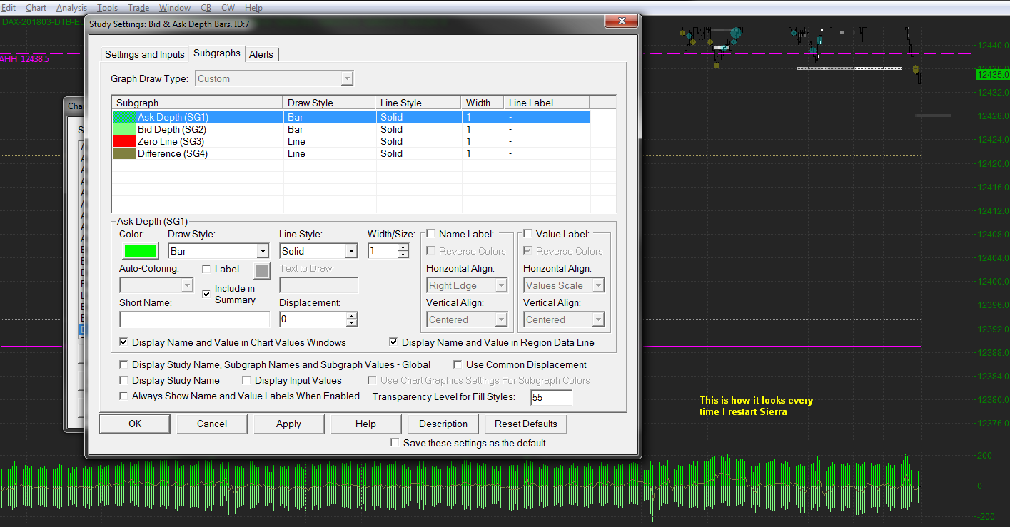 Using version 1697 (also was a problem in my previous version 1689). Using bid ask depth bars, every time I shutdown Sierra and then later on restart it, the graph has reset how I want this displayed. Using calculation mode "Bid Depth vs Ask Depth" Source Data "Historical Market Depth - Max" Set the following subgraphs to draw style ignore: Ask Depth Bid Depth Zero Line Set Difference to draw style "Bar". Save the workspace. Close Sierra. Restart it and open the workspace. All the subgraph drawstyles have been reset. |