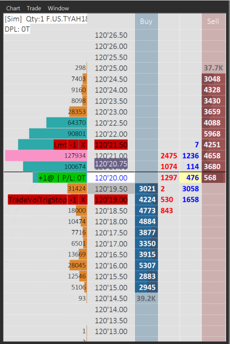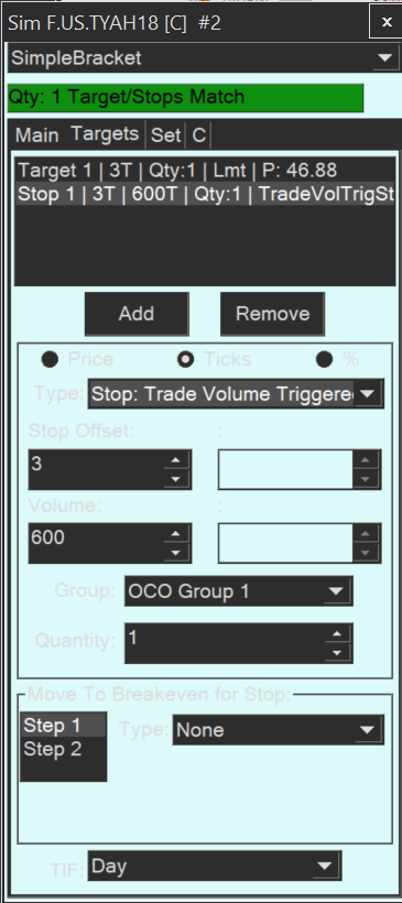 Here is the documentation we have for this order type so far: Order Types: Trade Volume Triggered Stop To help understand how much volume has been counted, make sure these options are enabled: Global Trade Settings Windows: Additional Order Information (Global Settings >> Chart Trade Settings >> Working Orders >> Working Orders - Display) https://www.sierrachart.com/index.php?page=doc/GlobalTradeSettings.html#ChartTradeSettings_DisplayDetailedOrderInformation Sierra Chart Support - Engineering Level Your definitive source for support. Other responses are from users. Try to keep your questions brief and to the point. Be aware of support policy: https://www.sierrachart.com/index.php?l=PostingInformation.php#GeneralInformation For the most reliable, advanced, and zero cost futures order routing, *change* to the Teton service: Sierra Chart Teton Futures Order Routing Date Time Of Last Edit: 2018-02-16 19:37:23