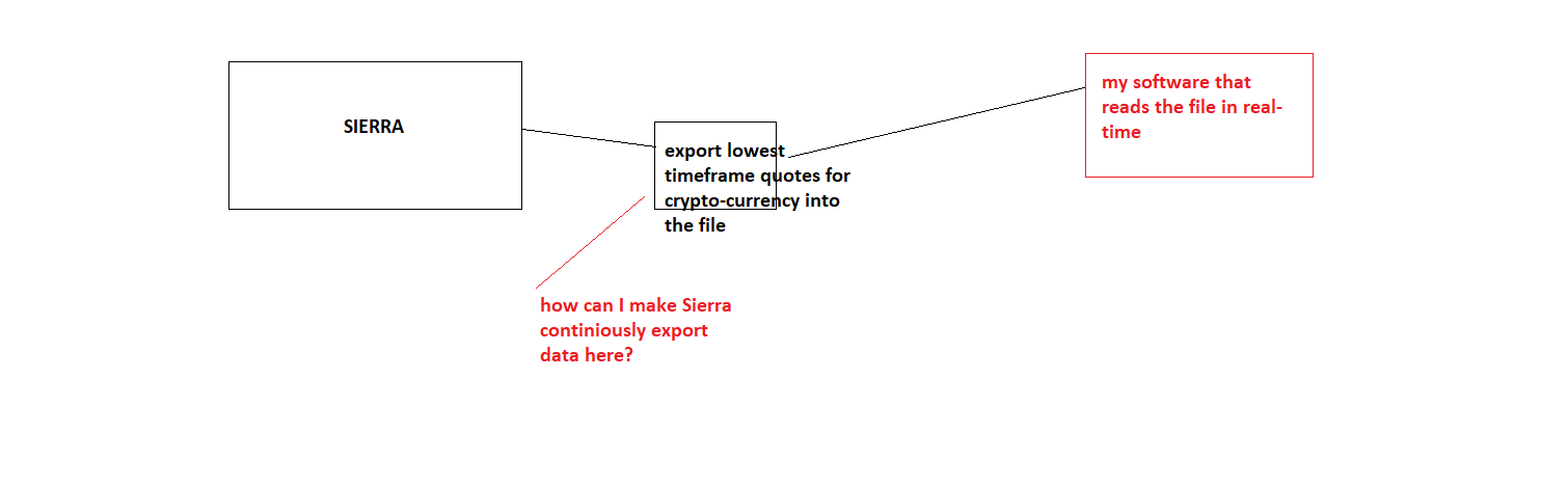 This can be done by using this study: Write Bar Data to File There is also the DTC Protocol Server: Data and Trading Communications (DTC) Protocol Server Sierra Chart Support - Engineering Level Your definitive source for support. Other responses are from users. Try to keep your questions brief and to the point. Be aware of support policy: https://www.sierrachart.com/index.php?l=PostingInformation.php#GeneralInformation For the most reliable, advanced, and zero cost futures order routing, *change* to the Teton service: Sierra Chart Teton Futures Order Routing |