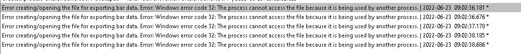We have looked into this and this is what we have determined: The output file containing the bar and study data is only open, when a write operation is being performed. Otherwise, Sierra Chart does not keep that file open. It is only momentarily open. When Sierra Chart writes to the file and the file is open during that time, it allows read access from any other process at that time. If Sierra Chart is unable to open the output file, it means that another process has exclusive write access to it and is not allowing write access. Sierra Chart Support - Engineering Level Your definitive source for support. Other responses are from users. Try to keep your questions brief and to the point. Be aware of support policy: https://www.sierrachart.com/index.php?l=PostingInformation.php#GeneralInformation For the most reliable, advanced, and zero cost futures order routing, *change* to the Teton service: Sierra Chart Teton Futures Order Routing |