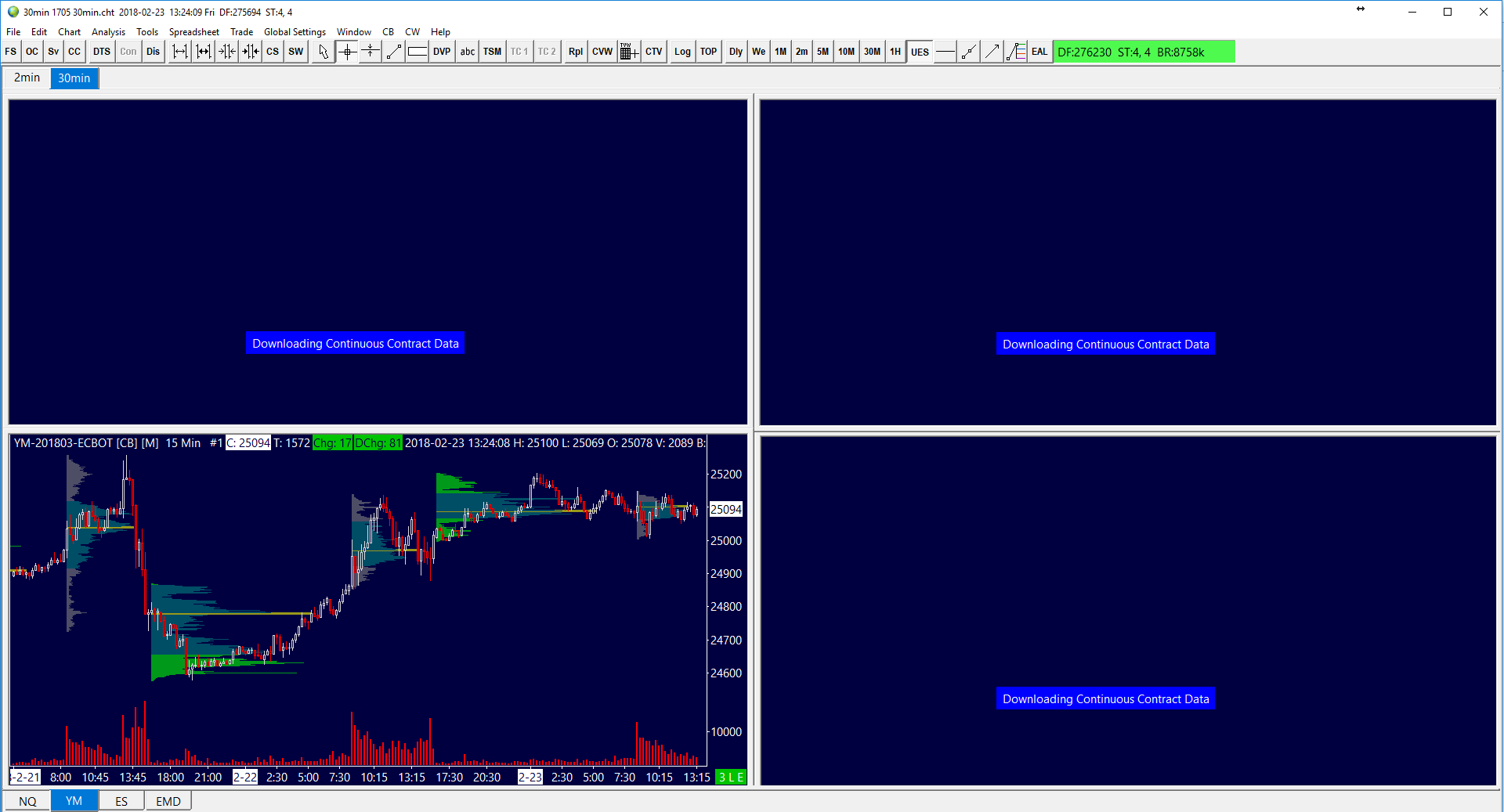 I can see there are delayed CME data like NQ and YM futures (more then 10's seconds) from Sierra chart. These data feeds also very often blackout with message: Waiting to download historical data. It isn't possible to live trade with such an issue. In regards to this, there was a software update done on one of our servers early this morning. That would have caused users to switch to the other server which would have interrupted the feed for two seconds for you. Also the charts would download missing historical data which would take another few seconds. But during that downloading time you would still see the price box on the right side of the chart update.There have been no other interruptions the last few days. Any software updates are always done between 5 PM to 6 PM US Eastern time when the CME is down. Sierra Chart Support - Engineering Level Your definitive source for support. Other responses are from users. Try to keep your questions brief and to the point. Be aware of support policy: https://www.sierrachart.com/index.php?l=PostingInformation.php#GeneralInformation For the most reliable, advanced, and zero cost futures order routing, *change* to the Teton service: Sierra Chart Teton Futures Order Routing Date Time Of Last Edit: 2018-02-23 18:09:10