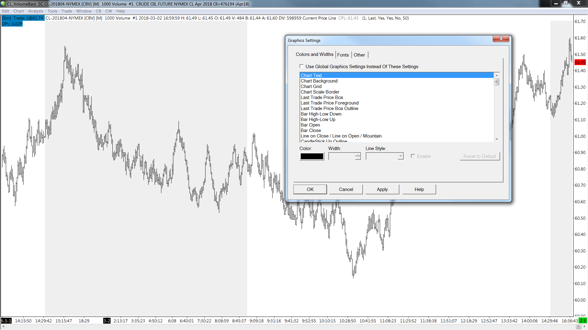 OK we understand. It should not always be using the global chart text color setting but using either the global or chart specific setting depending on how the Graphics Settings is set for the chart. This is now resolved. Sierra Chart Support - Engineering Level Your definitive source for support. Other responses are from users. Try to keep your questions brief and to the point. Be aware of support policy: https://www.sierrachart.com/index.php?l=PostingInformation.php#GeneralInformation For the most reliable, advanced, and zero cost futures order routing, *change* to the Teton service: Sierra Chart Teton Futures Order Routing |