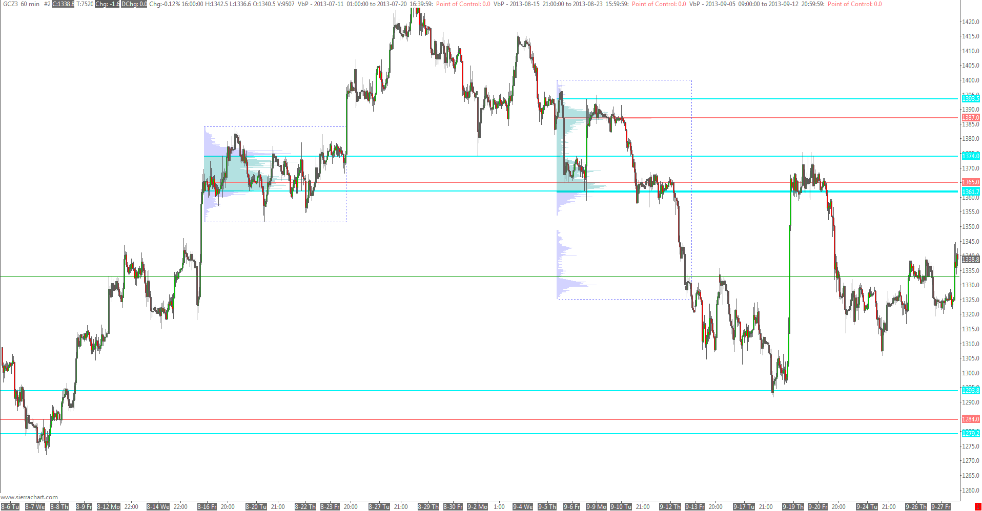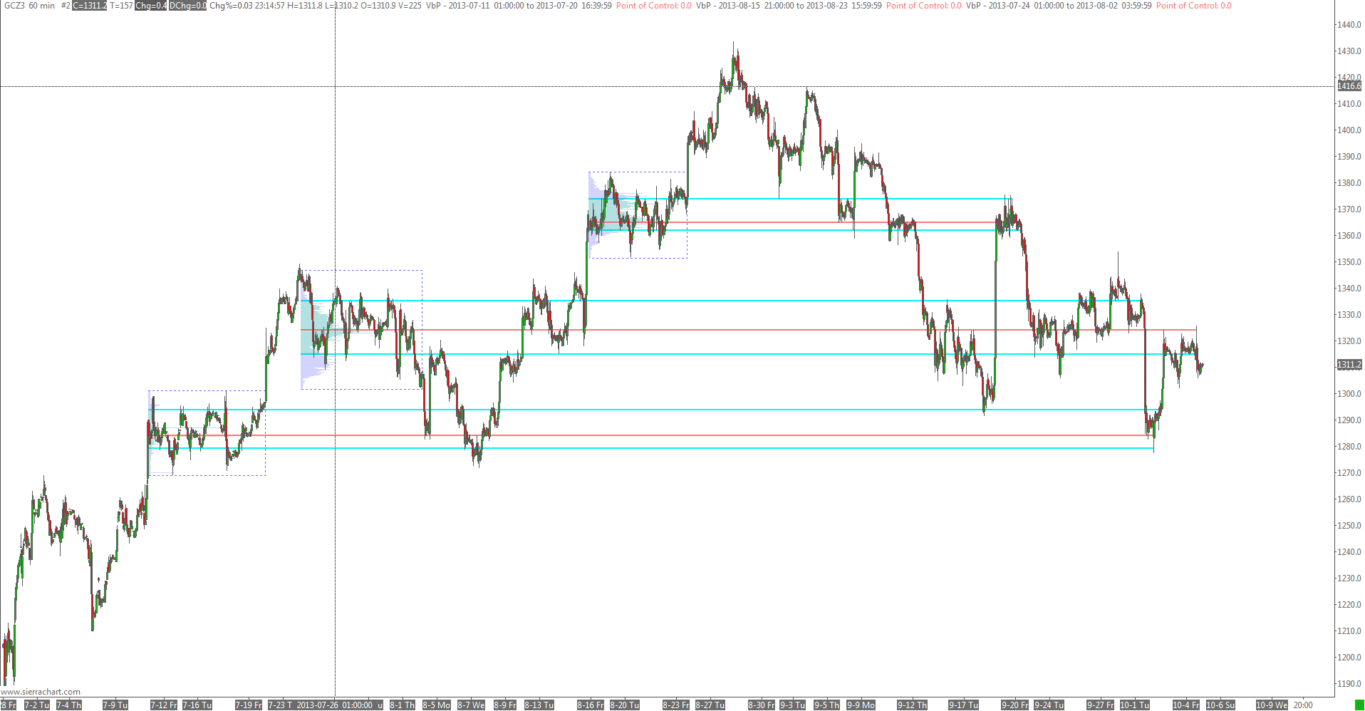 thanks again! this helps a lot, though I am not 100% sure how it works. looking at the chart now: http://www.sierrachart.com/image.php?l=1381086540961.png "when they intersect future prices" - well they stop after a couple of intersections with future prices. what eg is reason for stop of lines for the lowest profile? The thing is that intersection is not intersection. when prices only hit slightly the area it is still valid. once traded to other side for eg 20 USD (in case of gold) - that would invalidate. but anyway, pls dont think I am ungrateful, I very much appreciate you did change that. but in case you once find the time (whenever) it would be great to have an "until date/time" option. :-). I can also work around, no problem. when the VA is invalid I just change settings to "not extend lines" for those studies. |
