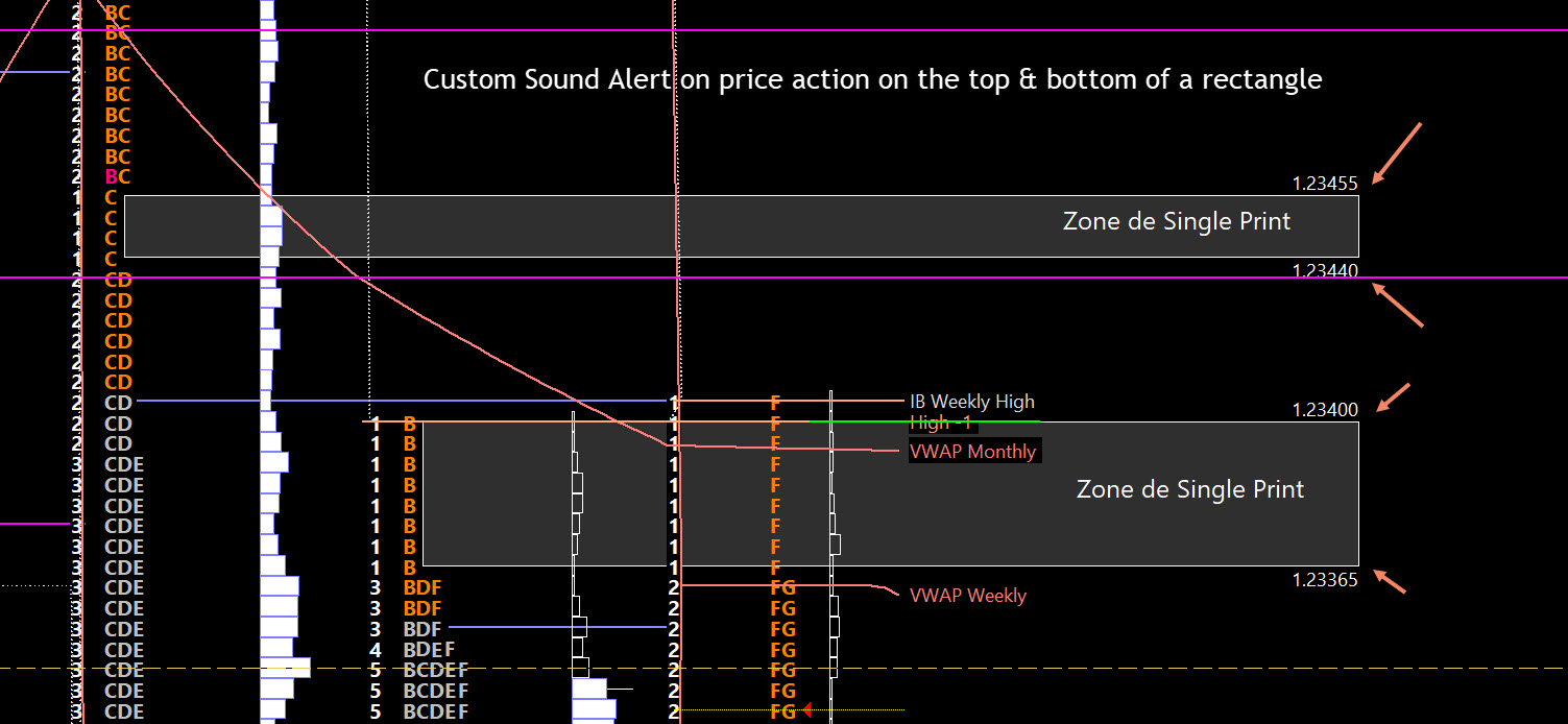 Hello Support, is it possible to define a custom sound alert both for the top and the bottom of a rectangle box ? In the case illustrated by the image attached, it is to trigger an alert when a single print area is touched by the price action. It would be nice to include this feature directly inside the rectangle avoiding to make another horizontal line for both side of the box ! Thanks for your feedback. |