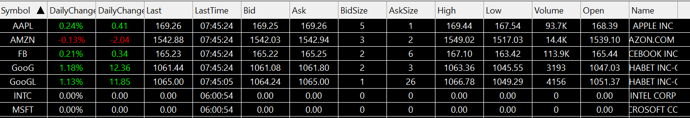 Some of the stock quotes don't update. I'm using IB, have data on stocks. On IB, the charts and quotes are fine. Please see the watch board. |