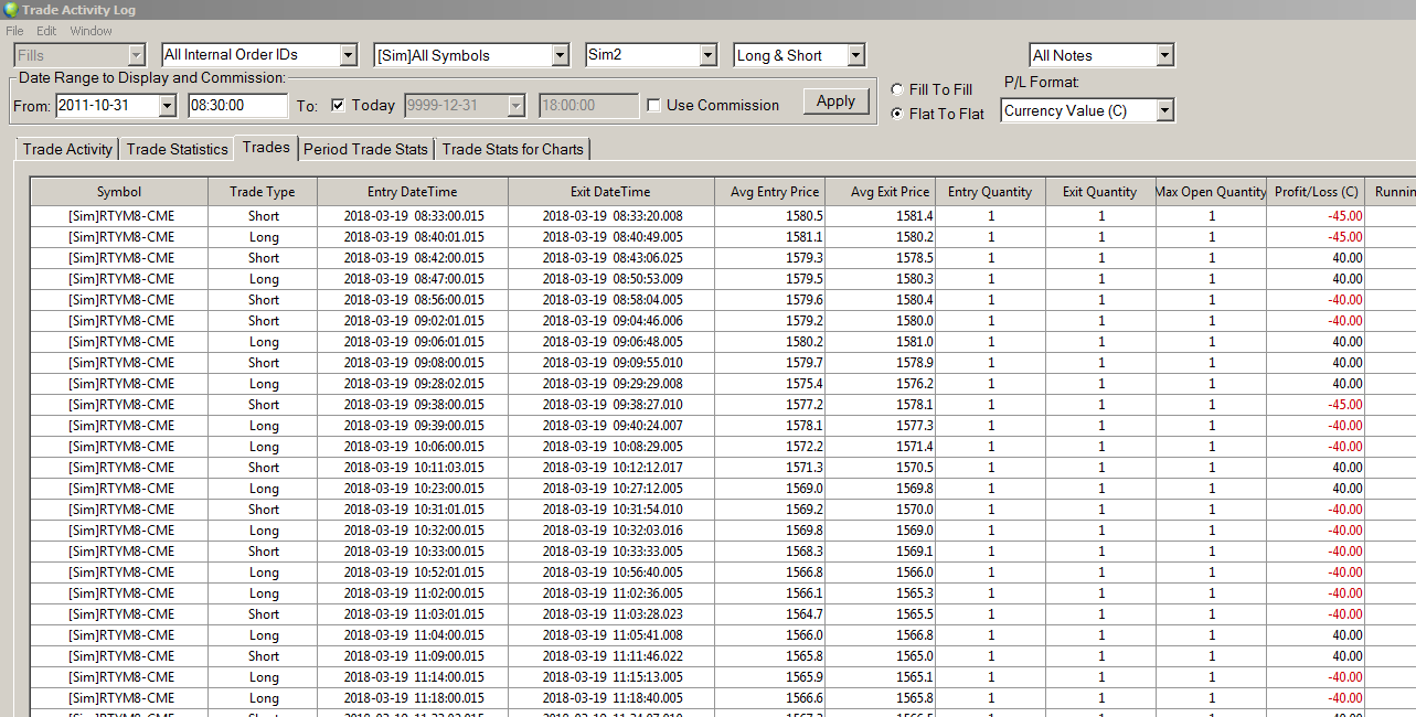 In post 10, you are apparently only pointing out inconsistency with timestamps. This is meaningless. And it has to do with the fact that there is other data in the Trade Activity Log, which is accumulating as you are changing the trade account, and timestamps need to be unique so this is why the milliseconds are incremented to avoid conflicts. There are no profit/loss discrepancies in our testing. None at all. So after this entire thread, what have you proven here? We have not identified any fault here in Sierra Chart. If there is, will take care of it. Therefore you can understand, why we are very assertive to users at times. When we know there is not a problem we are going to be very clear about that. And there is no problem. We simply cannot identify any issue. Obviously the original issue is an inconsistency with the submitted orders, and Profit/Loss. Millisecond timestamps differences are meaningless. So once again as we have said time and time again check your system if it is giving different results. Our example trading systems are not. We do not know why you are having an inconsistency with yours assuming you are with back tests. Now while looking into this, we did make a small performance improvement in 1726, and made absolutely certain there is 0.000000% potential for any variation. Sierra Chart Support - Engineering Level Your definitive source for support. Other responses are from users. Try to keep your questions brief and to the point. Be aware of support policy: https://www.sierrachart.com/index.php?l=PostingInformation.php#GeneralInformation For the most reliable, advanced, and zero cost futures order routing, *change* to the Teton service: Sierra Chart Teton Futures Order Routing Date Time Of Last Edit: 2018-03-29 05:02:24