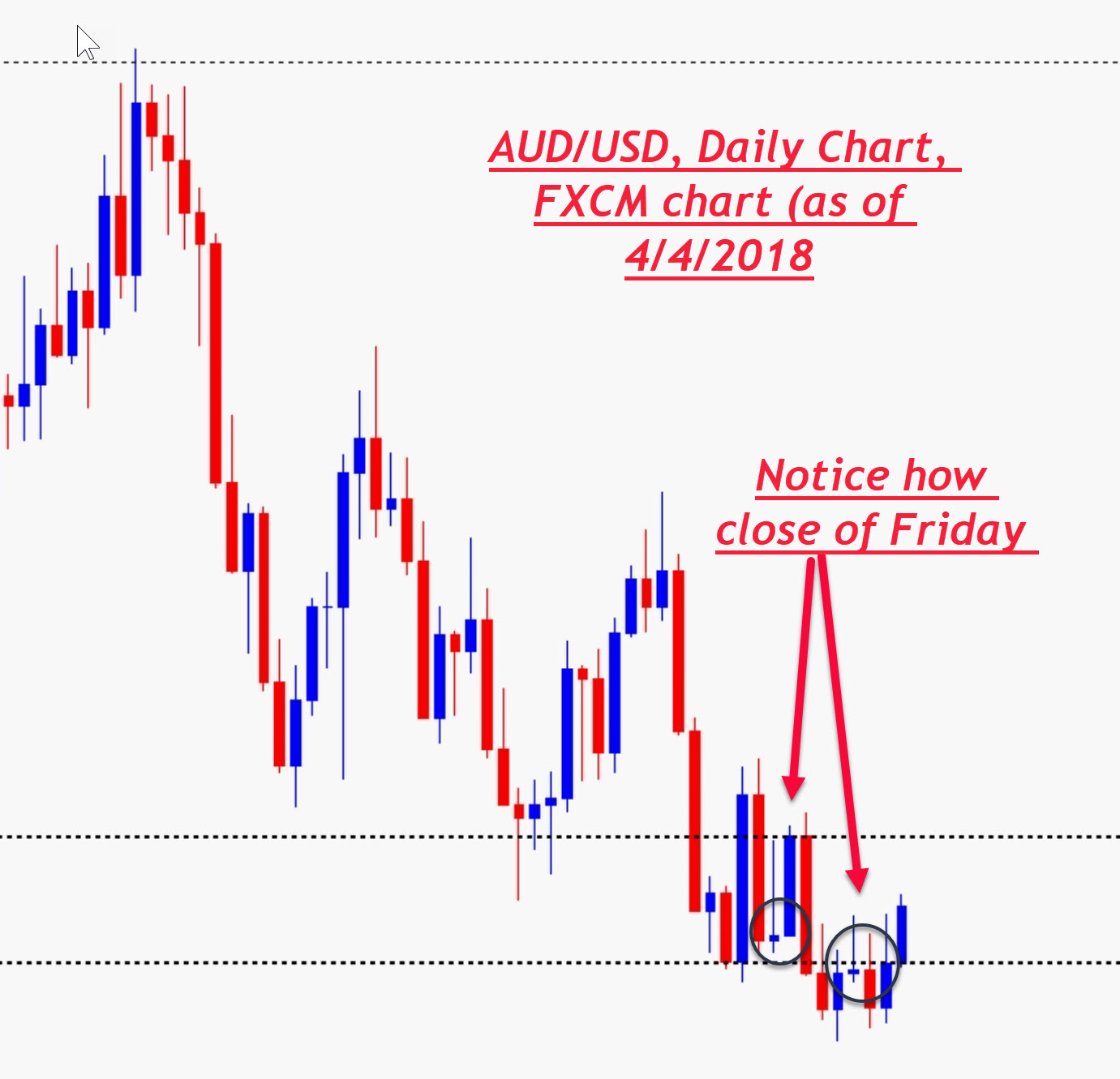 I have attached a screenshot from a friend's FXCM data feed (European provider). Note the close of the Friday Candlestick bar value is equal to the open of the Monday bar value. This is how I would the Daily Sierra chart configuration to appear. I hope you can provide configuration settings form my Sierra chart to display the Daily bars in this manner. Thank you for your help. |