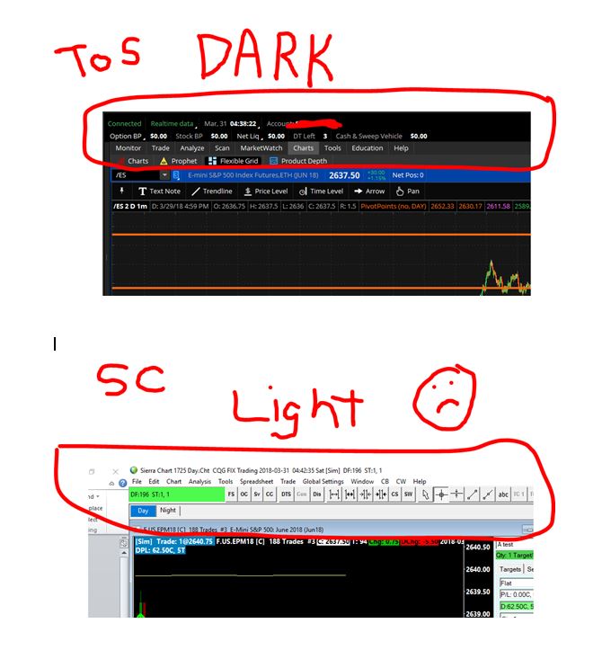 I am very happy with Sierra Charts, support and all the controls. Is there a setting to change the actual window that SC exists in, like Think of Swim's "Dark" settting? (see attached) Thanks Mark |
