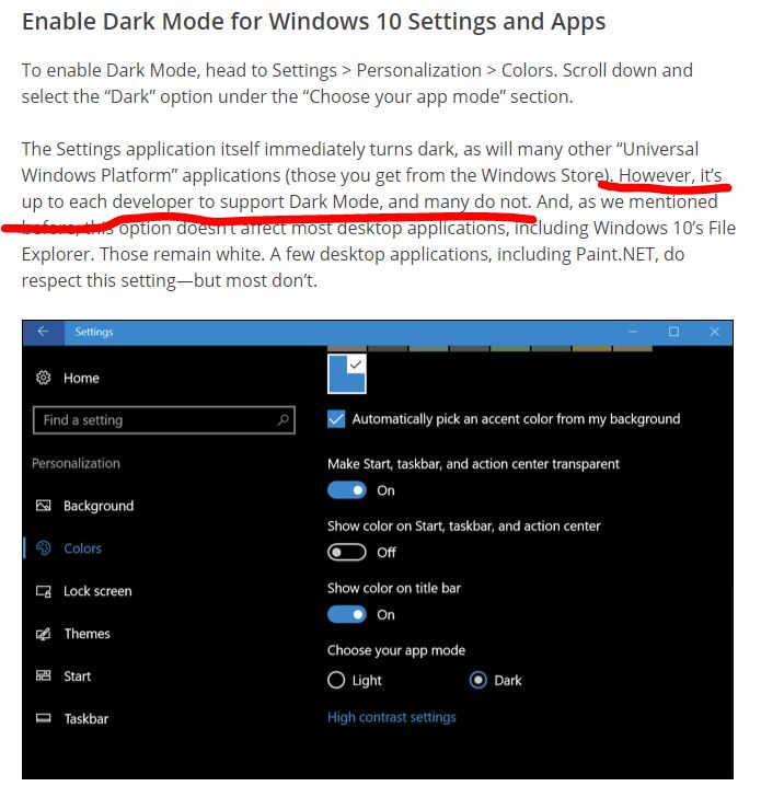 See my post here --> Dark Theme For Windows 10 Users For a 3rd party solution if you're interested. Scott |