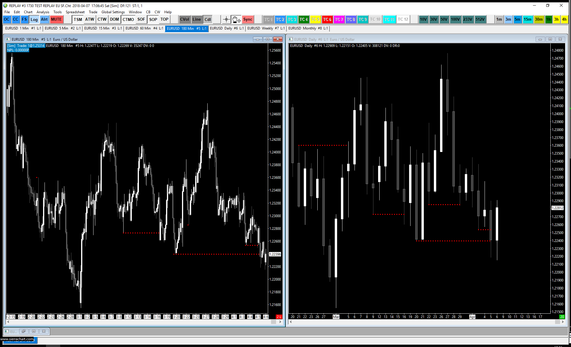 Hi, I've got a chartbook loaded with 2 charts, daily and 1hr with copy drawings enabled from the daily to 3hr chart. If i draw a OHLC ray with 'Extend until further intersection' option enabled on the daily chart, then on the 3hr chart the drawing sometimes draws as expected, but other times it appears but is not extended. I've also noticed that when I have a few of the OHLC rays drawn on the daily and they fail to extend on the 3hr, then the performance/responsiveness drops dramatically on the instance and can become unusable. FYI the performance issues are happening in a chartbook where I have 5 charts on which drawings are copied from the daily chart (no studies loaded and minimal days to load) Please see the image below for an example of where 2 of the OHLC rays were not extended http://www.sierrachart.com/image.php?Image=1523117204248.png I've got no studies loaded and using 365 days of data on 3hr chart. I've also set session times at 00:00:00 to 23:59:59. If I change the session times to 22:00:00 to 21:59:59 (which is what I normally use) then the issue happens even more frequently and different rays are affected and will not be extended. Btw, I've just tested this with the Horizontal Ray tool also and the same problem exists Thanks S Date Time Of Last Edit: 2018-04-07 16:14:17