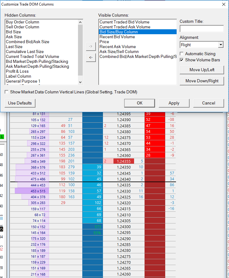 Refer to: Global Trade Settings Windows: Show Volume Bars (Trade >> Customize Chart/Trade DOM Columns) Sierra Chart Support - Engineering Level Your definitive source for support. Other responses are from users. Try to keep your questions brief and to the point. Be aware of support policy: https://www.sierrachart.com/index.php?l=PostingInformation.php#GeneralInformation For the most reliable, advanced, and zero cost futures order routing, *change* to the Teton service: Sierra Chart Teton Futures Order Routing |