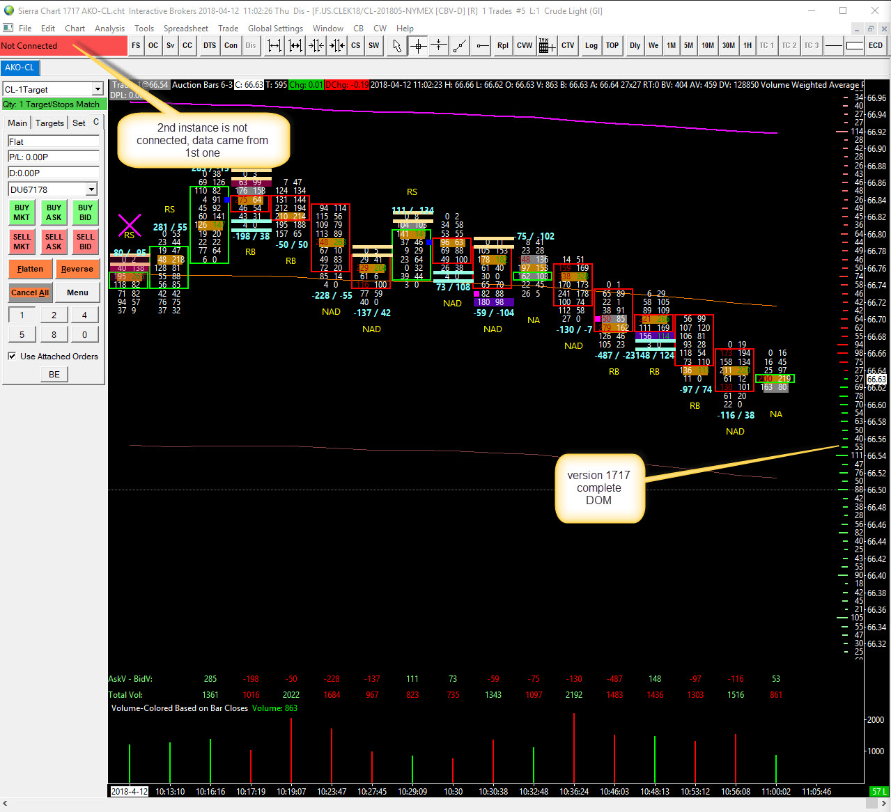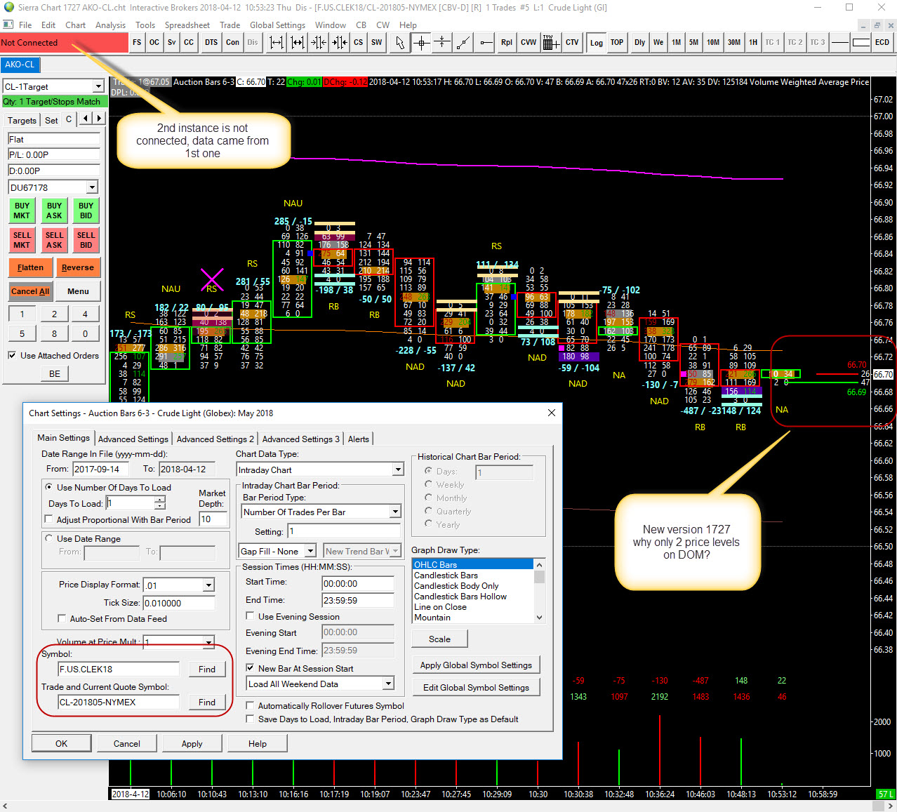 The functionality you are using with remote chart data files is out of date. Due to the changes with market depth in Sierra Chart, market depth data does not transfer between instances when using this feature. You need to instead use the Sierra Chart Exchange Data Feed for reliable data when using Interactive Brokers. Refer to this page for instructions: Sierra Chart Exchange Data Feed Sierra Chart Support - Engineering Level Your definitive source for support. Other responses are from users. Try to keep your questions brief and to the point. Be aware of support policy: https://www.sierrachart.com/index.php?l=PostingInformation.php#GeneralInformation For the most reliable, advanced, and zero cost futures order routing, *change* to the Teton service: Sierra Chart Teton Futures Order Routing Date Time Of Last Edit: 2018-04-12 19:14:16