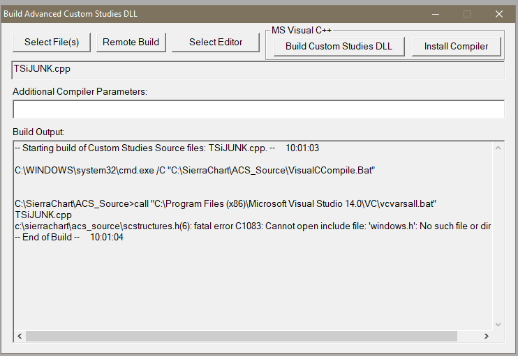 OK, this is an issue we cannot help with other than to recommend to use Remote Build. Why there is a problem with the Visual C++ compiler installation, we do not know. It really does not make sense why that particular error would be occurring. We ran a test on our side and did not encounter it. So it is something about your installation of Visual C++. Sierra Chart Support - Engineering Level Your definitive source for support. Other responses are from users. Try to keep your questions brief and to the point. Be aware of support policy: https://www.sierrachart.com/index.php?l=PostingInformation.php#GeneralInformation For the most reliable, advanced, and zero cost futures order routing, *change* to the Teton service: Sierra Chart Teton Futures Order Routing |