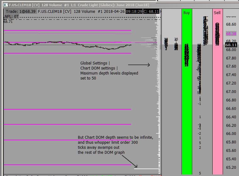 I have Global Settings | Chart DOM Settings | Maximum Depth Levels Displayed set to 50. But the Char DOM depth seems to be infinite. So a whopper limit order 300 ticks away swamps out the rest of the DOM Graph and the horizontal bars within 50 ticks of current price (the area I'm interested in) are too small to be of value. See attached. How can this be fixed? Thanks. Version 1736-64 bit. F.US.CLEM18, 128 Volume CQG, |
