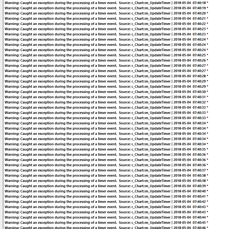 Something is not right on your side. We have no other user reporting this. And we do not observe this and it makes no sense. We want you to run Sierra Chart in Safe Mode: Sierra Chart - Software Login Instructions: Using Safe Mode And open just one chart and no other chart and let us know if you still see that error. Sierra Chart Support - Engineering Level Your definitive source for support. Other responses are from users. Try to keep your questions brief and to the point. Be aware of support policy: https://www.sierrachart.com/index.php?l=PostingInformation.php#GeneralInformation For the most reliable, advanced, and zero cost futures order routing, *change* to the Teton service: Sierra Chart Teton Futures Order Routing Date Time Of Last Edit: 2018-05-04 15:22:28