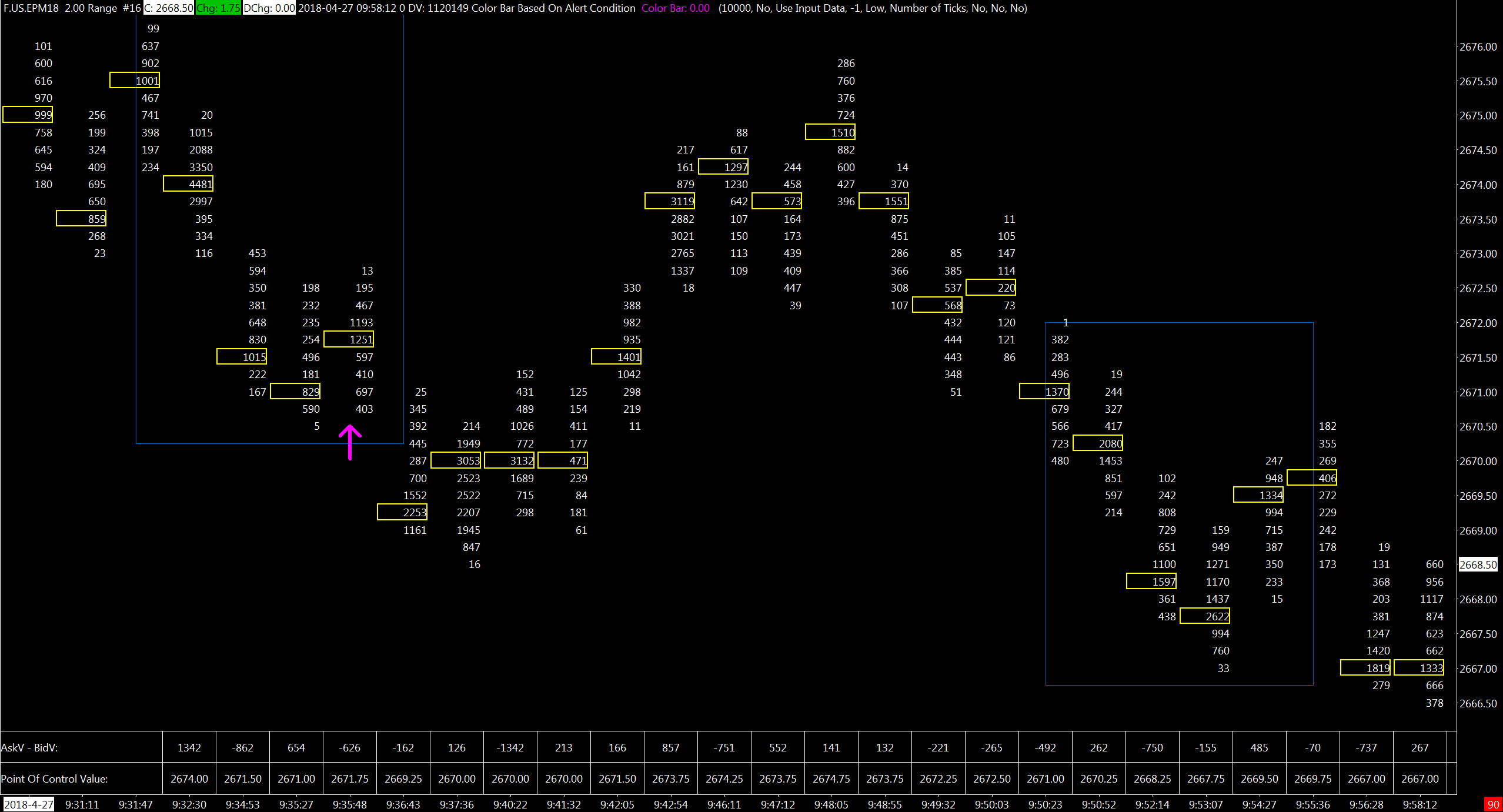 ES Futures numbers bars Changed the background to no color and turned on the highlight of the point of control. Numbers Bars Calculated Values. Turned on display of point of control value. Color Bar Alert Condition: AND( ID2.SG42[-3]<ID2.SG42[-4], ID2.SG42[-2]<ID2.SG42[-3], ID2.SG42[-1]<ID2.SG42[-2], ID2.SG42[0]>ID2.SG42[-1]) Basically, it draws an arrow when the Point of Control, 4 down in a row, followed by 1 up. http://www.sierrachart.com/image.php?Image=152496775798.png I drew a rectangle around a 5 bar sequence where it worked as expected, and one where it did not. Thanks. |
