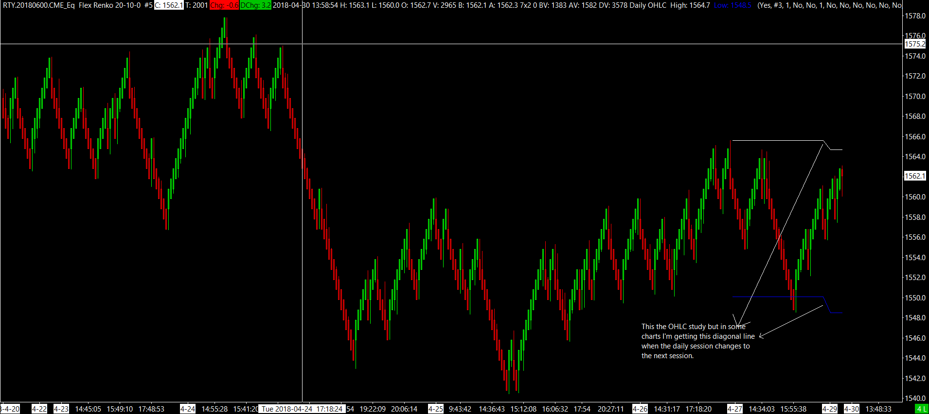 OK we understand now. If you have the Daily OHLC study set to calculate only 1 day, it is necessary to select Chart >> Reload and Recalculate to clear the prior results. This is not any type of malfunction. This is just by design. The prior data is not going to get cleared automatically. Sierra Chart Support - Engineering Level Your definitive source for support. Other responses are from users. Try to keep your questions brief and to the point. Be aware of support policy: https://www.sierrachart.com/index.php?l=PostingInformation.php#GeneralInformation For the most reliable, advanced, and zero cost futures order routing, *change* to the Teton service: Sierra Chart Teton Futures Order Routing Date Time Of Last Edit: 2018-05-01 00:18:20