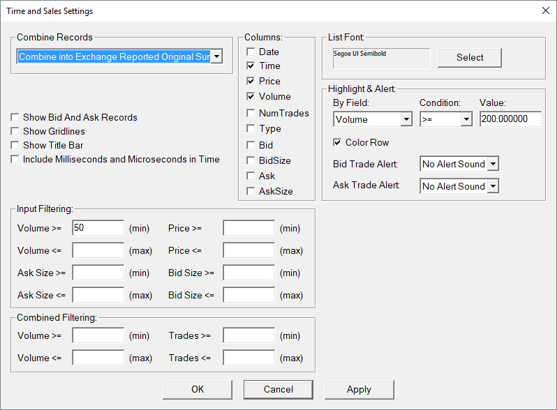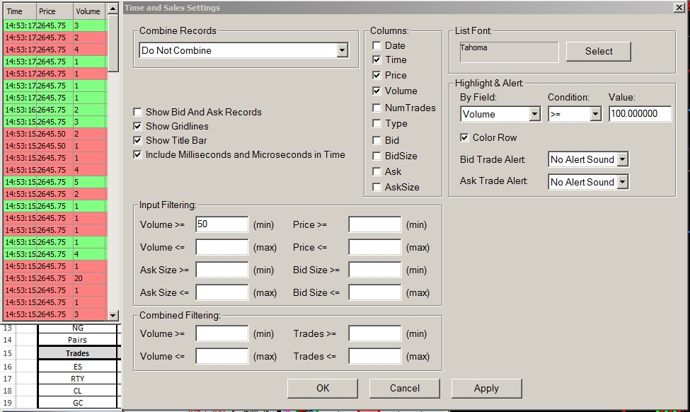See attached printscreen that shows the Time and Sales Window and its Times and Sales Settings window.