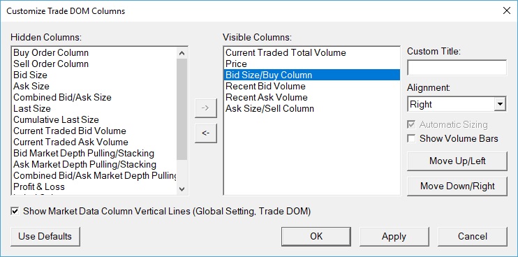 Also, when using the Last Size column in the Trading DOM, the background coloring of the column is entering into another column (Ask Size/ Sell column in this case). How can this be prevented? The screenshot is also attached - note the background overlapping with the column on the left Global Trade Settings Windows: Automatic Sizing (Trade >> Customize Chart/Trade DOM Columns) When hovering with a mouse arrow over Buy/ Sell columns the selection rectangle appears which is not uniform in color and not the same size. Please see the screenshot.