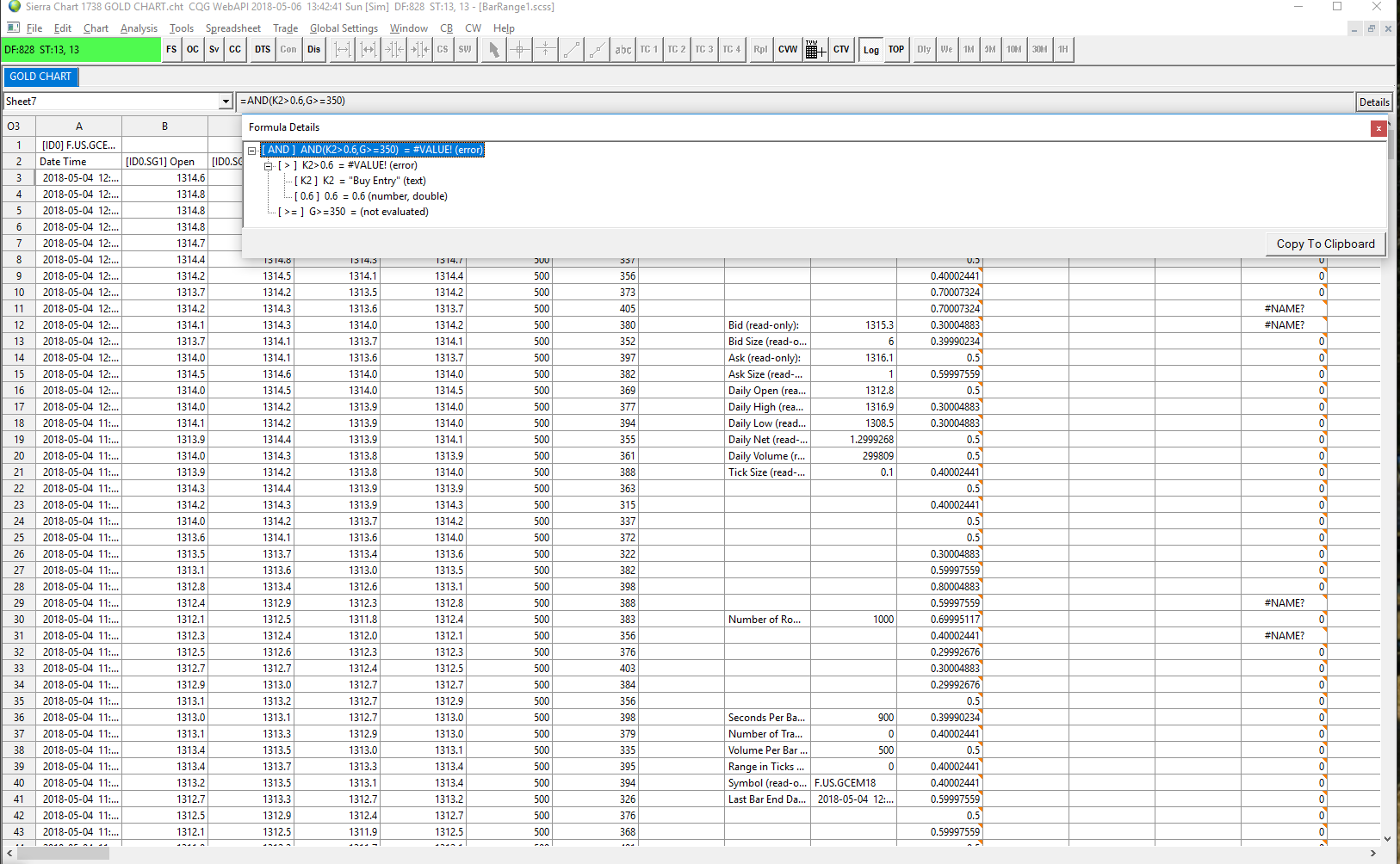In a spreadsheet Formula Column's row 3, try this: =AND(G3>=350,(C3-D3)/$J$21>6) You can also do this with the Color Bar Based On Alert Condition study, using the Simple Alert syntax: =AND(NT>=350,(H-L)/TICKSIZE>6) |