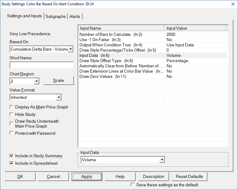 OK, I seem to have followed the directions but I'm unsure where I"m making a mistake. I have the color study beneath the number of trades study, it's in chart region 2 (where the umber of trades is. Here's the formula in the alerts window =(BV>AV) Output is based on input data and it's based on the Cumulative Delta Bars - Volume study. What am I missing? |