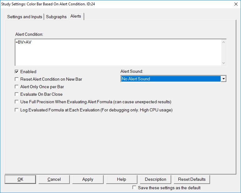 Since you are wanting to apply this to the Bars that are in the Number of Trades, you need to change the Draw Style of the Color Bar Based on Alert Condition Subgraph to Bar. In other words, it needs to be the same as the subgraph that it is trying to draw on. Make sure that the Subgraph of the Color Bar Based on Alert Condition study uses the same Width of the study it is drawing on top of. This is noted in Step 9 of the following documentation: Color Bar Based on Alert Condition: Coloring Subgraphs of Other Studies For the most reliable, advanced, and zero cost futures order routing, use the Teton service: Sierra Chart Teton Futures Order Routing Date Time Of Last Edit: 2018-05-14 19:00:21