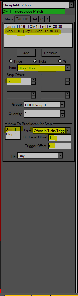 Here's an example using Bracket Orders for both a Stop and a Target when placing an order. After you've adjusted your settings, You MUST remember to name and Save Configuration using the Menu or M on the Trade Window. This is the step most people new to adjusting these settings forget in my experience. * Start by selecting Simple Bracket or one of the other bracket examples in the Trade Window Dropdown Menu. * Select the Targets Tab on the Trade Window * Highlight the Stop in the upper window. * Enter your Stop Limit, (in your case 6 ticks) in the Stop Offset box. * In the lower left window Move to Breakeven For Stop select Step 1 then select the Type Offset in Ticks Triggered. You want to put 1 in the BE Level Offset box. NOW, put 8 in the Trigger Offset box. This will now move your Stop from -6 ticks to +1 tick when price touches 8 ticks beyond your entry. Now...SAVE your work by going to the Menu or M button on the Main tab and selecting Save Configuration as mentioned above. IF you wish to add a second higher stop if price continues to move up, you could do so by selecting the Step 2 option and repeating the above. Otherwise just leave it as None. You can adjust your Target price the same way using the Target 1 highlight back at the top of the window if you want. Don't forget to click the Use Attached Orders box on the Main tab if using bracket orders. Hope that helps. See the images I've attached below to see where this changes should be made --> -- Scott Date Time Of Last Edit: 2018-05-14 21:49:23