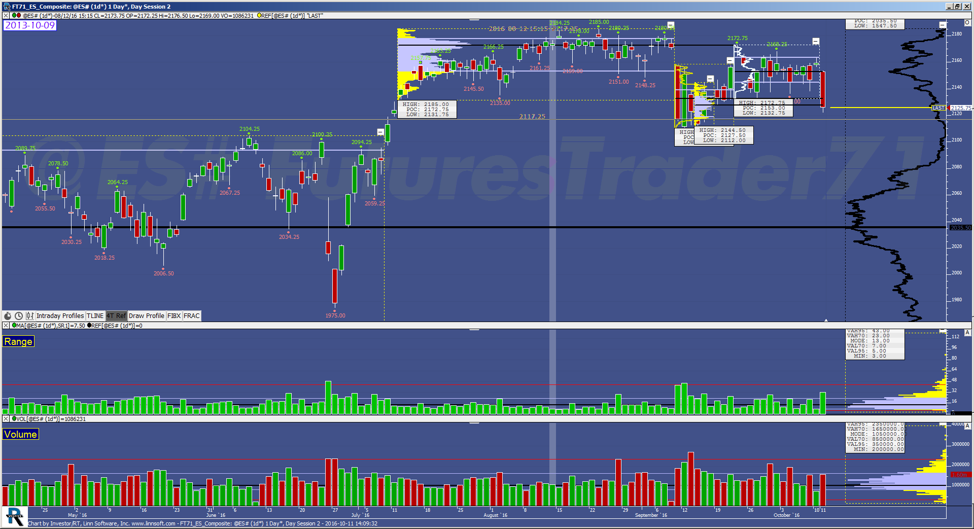 Is there the ability to, or the possibility of adding the ability to, display a Profile on an indicator? Investor R/T has this. For example, one could add the Bar Difference study to a daily chart to see daily ranges. Then, one could add a profile of this study to see the cumulative distribution of these ranges, getting more information than from just a moving average. I'm interested in your feedback. Thanks! |