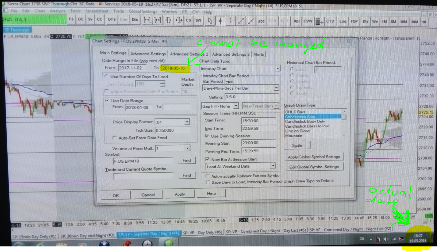 Hello Sierra, I am currently testing your platform and am very impressed. However, I'm experiencing an error that freezes all charts from the 16th (being the last day to look at) till today. I read through a lot of your support tips, checked and can asure the following: •Symbol settings are updated •I scrolled to the end of the chart •"Disable Data File Updating" is disabled •I made sure that no dates are excluded •Historical Data Download is always successful •The connection to the data feed is successfully established •Although I had storage space issues, no "Windows Error Code 8" is listed in the Message Log However, I noticed that the box in Chart Settings -> Main Settings -> "Date Range in File" -> "to" is filled with 16.05.2018 and can NOT be changed (see attached file). How do I solve this issue? PS: It is especially frustrating since my trial will expire on the 21st, which is why I wanted to ask if it was possible to extend my trial to the indicated 30 days (I read that this was possible) Thanks in advance and have a great weekend |
