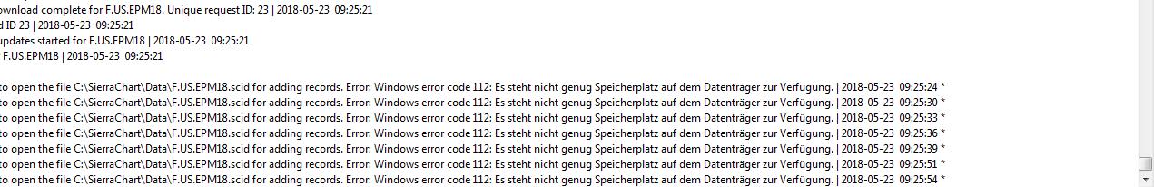 Yes, error message 112 does mean "There is not enough space on the disk. ". That definitively is the problem. Change the Data Files Folder to a different drive if you have another drive with available space: http://www.sierrachart.com/index.php?page=doc/GeneralSettings.html#DataFilesFolder How come the F.US.EPM18 does not show price movement in candlestick devolopment (however does so in the price tag on the right of the Chart), while the F.US.DDM18 is moving perfectly fine, although being connected to the same Data Feed and using the same computer for storage? Not really sure, but it certainly is going to be related to the fact that there is not enough drive space. That is actually a very serious issue. Once you get it resolved, re-download the data in the chart: Re-download all the data in the chart by going to the chart and selecting "Edit >> Delete All Data and Download". You just need to do this once per symbol. Sierra Chart Support - Engineering Level Your definitive source for support. Other responses are from users. Try to keep your questions brief and to the point. Be aware of support policy: https://www.sierrachart.com/index.php?l=PostingInformation.php#GeneralInformation For the most reliable, advanced, and zero cost futures order routing, *change* to the Teton service: Sierra Chart Teton Futures Order Routing Date Time Of Last Edit: 2018-05-23 17:43:33