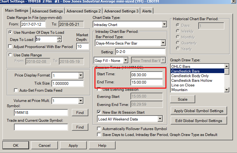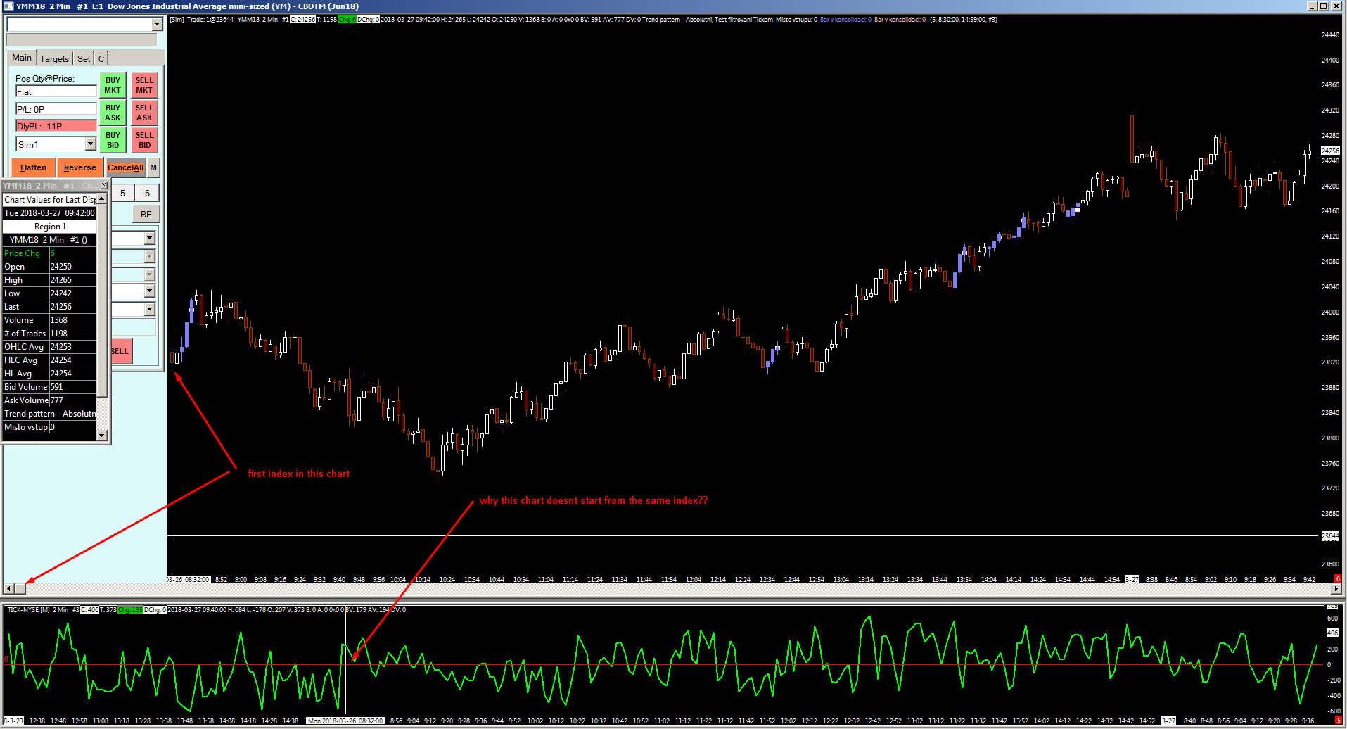 hello, i have a question on how to set the charts to load correct numbers of indexes. i have written an acsil study that uses arrays of another chart (tick nyse) - i understand, that in order to make the backtest result correct, i need to have the same number of indexes on both charts YM (as main chart and tick nyse as the chart i take the arrays from). but what i dont know is how to actually make it happened. when i load lets say 60 days to test it, the staring index on YM is different from the starting index in TickNyse. even though i have set the same RTH for both the charts, and linked the charts in advanced setting so that they should load the same number days, start at the same time etc.. and thus having the same number of indexes, it still doesn´t happen. therefore i cannot proceed a correct backtest.. what am i doing wrong? can you please tell me how to solve this issue? |