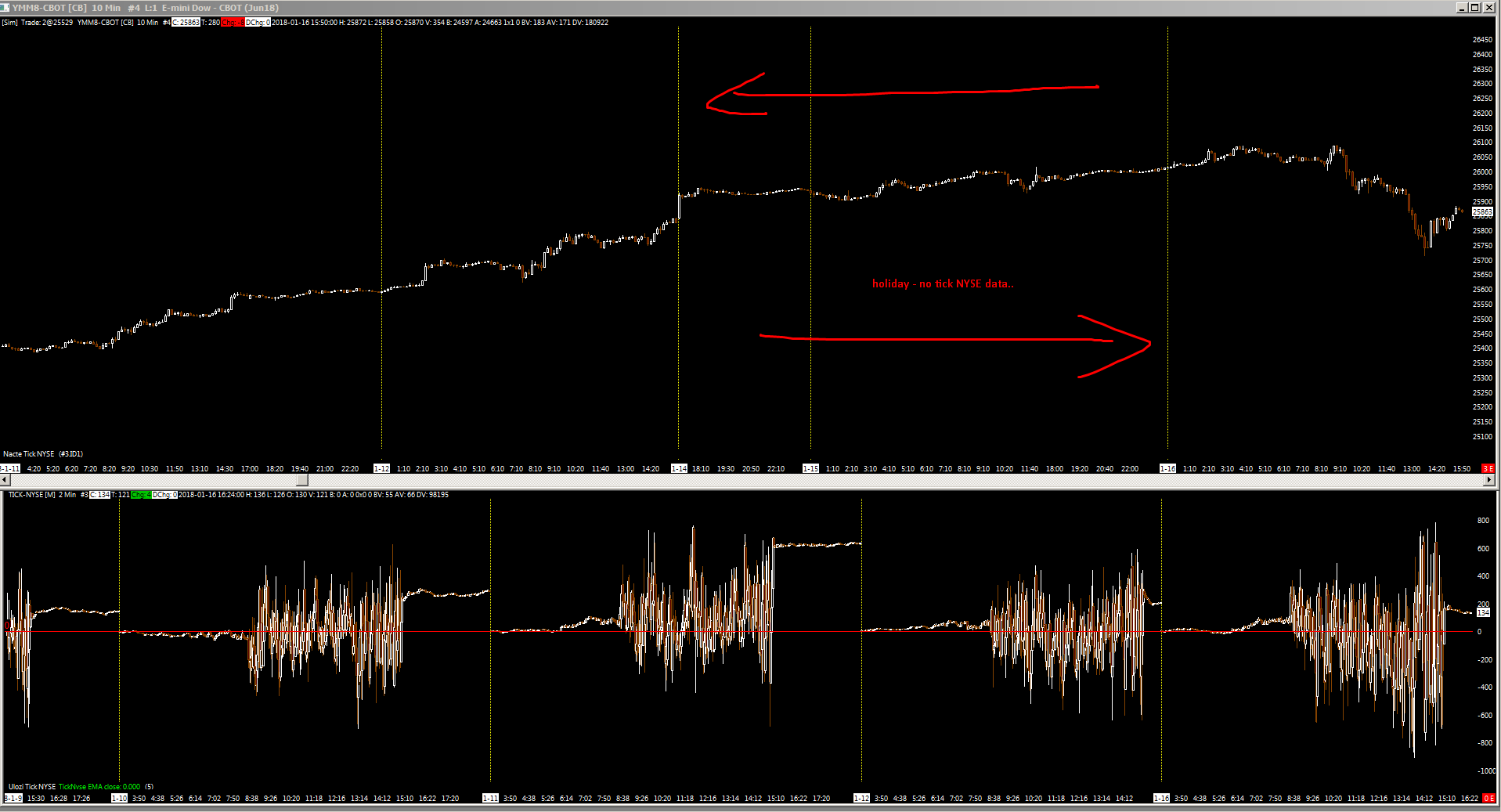 well, ok, i must be either a complete idiot, or there is something wrong in the functions, or it is all much more complicated and complex that what is described there. because i got always some sort of mistake no matter how much i try to make it work according to what is described there. simple example i have tick nyse chart and i need to load its arrays into the the YM chart, and put an entry according to a value at an appropriate index. but sometimes there are holidays at NYSE and tick nyse has no data, while futures has data.. how will i set the propper indexing arrays? i mean, i suppose it should skip these no data periods when there are holidays and starts continuing backtest after at the propper index, but it doesnt. it just messes up the indexes when it hits theses days.. Date Time Of Last Edit: 2018-06-03 12:42:50