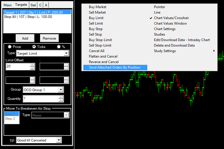 Here is the relevant documentation for this: Order Types: Send Attached Orders - Position/Price Sierra Chart Support - Engineering Level Your definitive source for support. Other responses are from users. Try to keep your questions brief and to the point. Be aware of support policy: https://www.sierrachart.com/index.php?l=PostingInformation.php#GeneralInformation For the most reliable, advanced, and zero cost futures order routing, *change* to the Teton service: Sierra Chart Teton Futures Order Routing |