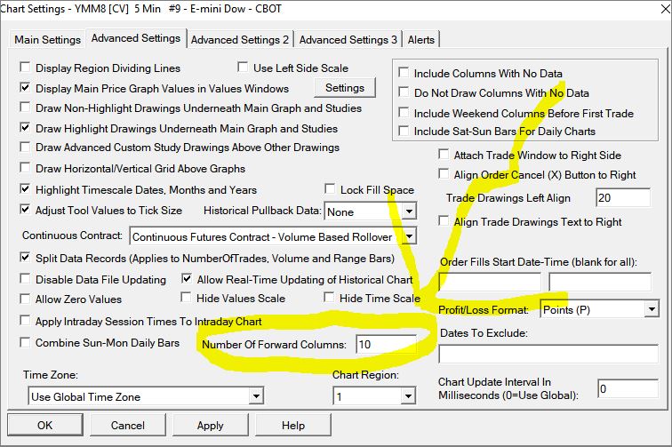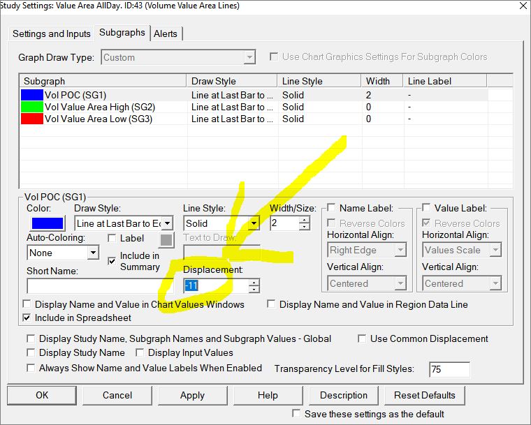 then this is a mystery because the image in the previous post is Sierra charts! i remember that i have used the displacement feature from study subgraph settings (see picture ''displacement'') with a minus setting below -10 (like -11 or -15 etc ) and number of forwarded columns from chart settings to 10 (see picture ''forward columns'') but with same settings now i cant reproduce the same result |