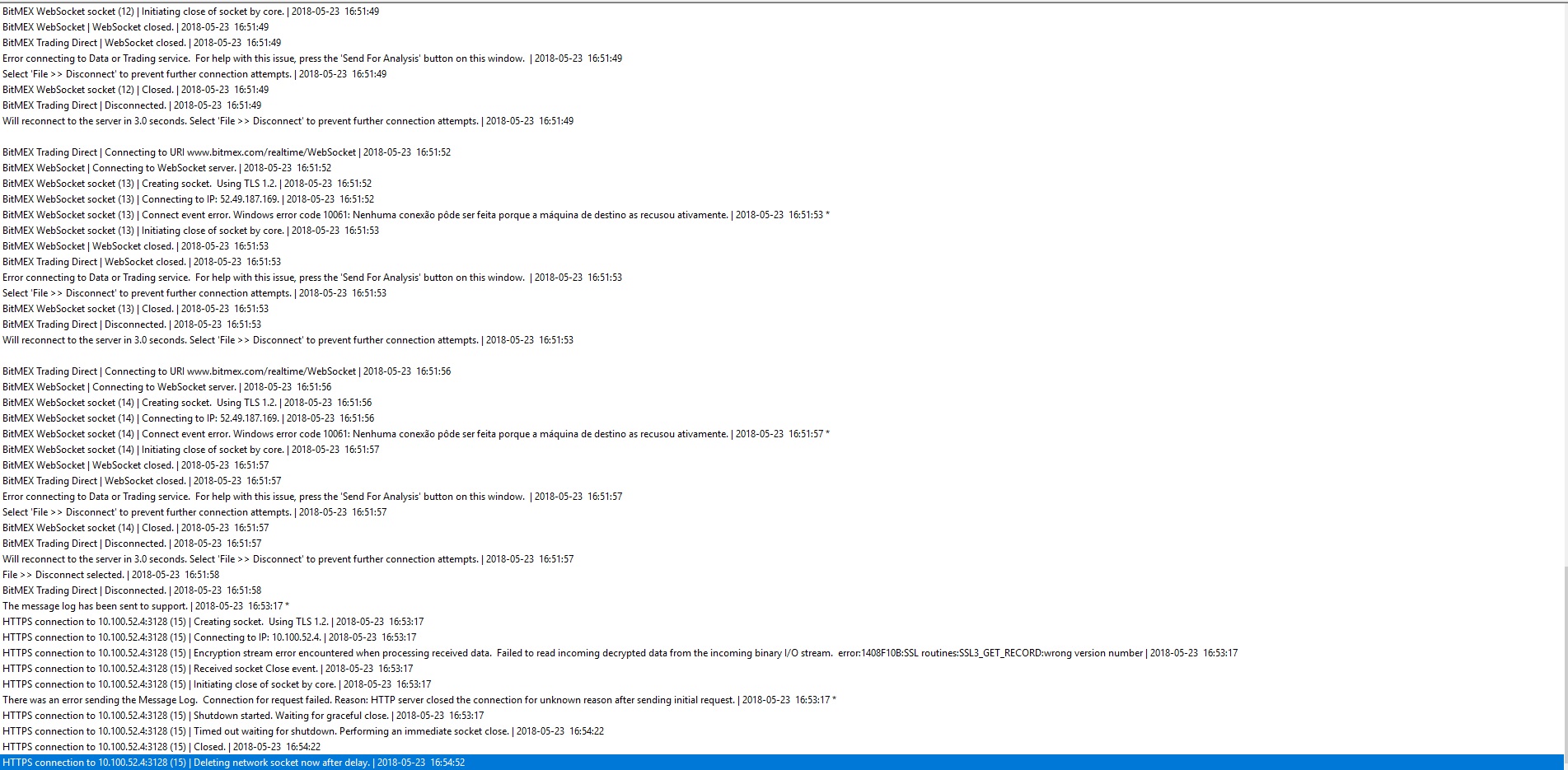 Hello, i am having trouble to connect with my proxy settings. Need support to configure it, please. The message log is as it follows: HTTPS connection to www.sierrachart.com:443 (2) | Creating socket. Using TLS 1.2. | 2018-05-23 16:51:09 HTTPS connection to www.sierrachart.com:443 (2) | Connecting to IP: 204.15.192.108. | 2018-05-23 16:51:09 Reading Internal Order ID file. | 2018-05-23 16:51:09 HTTPS connection to www.sierrachart.com:443 (2) | Connect event error. Windows error code 10061: Nenhuma conexão pôde ser feita porque a máquina de destino as recusou ativamente. | 2018-05-23 16:51:10 * Reading Trade Orders file. | 2018-05-23 16:51:14 Reading Trade Positions file. | 2018-05-23 16:51:14 Listening on UDP port 22904. | 2018-05-23 16:51:14 Software version: 1746 64-bit | 2018-05-23 16:51:14 Usage end date: 2018-06-18 | 2018-05-23 16:51:14 Enabled for: Advanced Features. | 2018-05-23 16:51:14 Enabled for: Advanced Features 2. | 2018-05-23 16:51:14 Enabled for: Sierra Chart Historical Data Service. | 2018-05-23 16:51:14 Allow Support for Sierra Chart Data Feeds is enabled. | 2018-05-23 16:51:14 Current selected Data/Trading service: BitMEX Trading Direct | 2018-05-23 16:51:14 Chart Update Interval: 500 | 2018-05-23 16:51:14 Time Zone: +01:00:00 (GMT+00BST+01,M3.5.0/01:00,M10.5.0/02:00) | 2018-05-23 16:51:14 2018-05-23 12:51:14 Local computer time | 2018-05-23 16:51:14 2018-05-23 15:51:14 Local computer time in UTC | 2018-05-23 16:51:14 2018-05-23 16:51:14 Local computer time in SC Time Zone | 2018-05-23 16:51:14 Program path: C:\SierraChart\ | 2018-05-23 16:51:14 Data Files path: C:\SierraChart\Data\ | 2018-05-23 16:51:14 OS Version Number: 10.0 | 2018-05-23 16:51:14 Locale Setting: C | 2018-05-23 16:51:14 Checking for new symbol settings for service code bitmex.exchange.trading | 2018-05-23 16:51:14 HTTPS connection to www.sierrachart.com:443 (4) | Creating socket. Using TLS 1.2. | 2018-05-23 16:51:14 HTTPS connection to www.sierrachart.com:443 (4) | Connecting to IP: 204.15.192.108. | 2018-05-23 16:51:14 HTTPS connection to www.sierrachart.com:443 (2) | Initiating close of socket by core. | 2018-05-23 16:51:14 HTTPS connection to www.sierrachart.com:443 (2) | Closed. | 2018-05-23 16:51:14 HTTPS connection to www.sierrachart.com:443 (4) | Connect event error. Windows error code 10061: Nenhuma conexão pôde ser feita porque a máquina de destino as recusou ativamente. | 2018-05-23 16:51:15 * HTTPS connection to www.sierrachart.com:443 (4) | Initiating close of socket by core. | 2018-05-23 16:51:15 HTTP request 1 for symbol settings MD5 for bitmex.exchange.trading Connection for request failed. Reason: Error connecting to HTTP server. | 2018-05-23 16:51:15 HTTPS connection to www.sierrachart.com:443 (4) | Closed. | 2018-05-23 16:51:15 BitMEX Trading Direct | Connecting to URI www.bitmex.com/realtime/WebSocket | 2018-05-23 16:51:18 BitMEX WebSocket | Connecting to WebSocket server. | 2018-05-23 16:51:18 BitMEX WebSocket socket (5) | Creating socket. Using TLS 1.2. | 2018-05-23 16:51:19 BitMEX WebSocket socket (5) | Connecting to IP: 52.49.187.169. | 2018-05-23 16:51:19 BitMEX WebSocket socket (5) | Connect event error. Windows error code 10061: Nenhuma conexão pôde ser feita porque a máquina de destino as recusou ativamente. | 2018-05-23 16:51:20 * BitMEX WebSocket socket (5) | Initiating close of socket by core. | 2018-05-23 16:51:20 BitMEX WebSocket socket (5) | Closed. | 2018-05-23 16:51:20 BitMEX WebSocket | WebSocket closed. | 2018-05-23 16:51:20 BitMEX Trading Direct | WebSocket closed. | 2018-05-23 16:51:20 Error connecting to Data or Trading service. For help with this issue, press the 'Send For Analysis' button on this window. | 2018-05-23 16:51:20 Select 'File >> Disconnect' to prevent further connection attempts. | 2018-05-23 16:51:20 BitMEX Trading Direct | Disconnected. | 2018-05-23 16:51:20 Will reconnect to the server in 3.0 seconds. Select 'File >> Disconnect' to prevent further connection attempts. | 2018-05-23 16:51:20 BitMEX Trading Direct | Connecting to URI www.bitmex.com/realtime/WebSocket | 2018-05-23 16:51:23 BitMEX WebSocket | Connecting to WebSocket server. | 2018-05-23 16:51:23 BitMEX WebSocket socket (6) | Creating socket. Using TLS 1.2. | 2018-05-23 16:51:23 BitMEX WebSocket socket (6) | Connecting to IP: 52.49.187.169. | 2018-05-23 16:51:23 BitMEX WebSocket socket (6) | Connect event error. Windows error code 10061: Nenhuma conexão pôde ser feita porque a máquina de destino as recusou ativamente. | 2018-05-23 16:51:24 * BitMEX WebSocket socket (6) | Initiating close of socket by core. | 2018-05-23 16:51:24 BitMEX WebSocket | WebSocket closed. | 2018-05-23 16:51:24 BitMEX Trading Direct | WebSocket closed. | 2018-05-23 16:51:24 Error connecting to Data or Trading service. For help with this issue, press the 'Send For Analysis' button on this window. | 2018-05-23 16:51:24 Select 'File >> Disconnect' to prevent further connection attempts. | 2018-05-23 16:51:24 BitMEX WebSocket socket (6) | Closed. | 2018-05-23 16:51:24 BitMEX Trading Direct | Disconnected. | 2018-05-23 16:51:24 Will reconnect to the server in 3.0 seconds. Select 'File >> Disconnect' to prevent further connection attempts. | 2018-05-23 16:51:24 BitMEX Trading Direct | Connecting to URI www.bitmex.com/realtime/WebSocket | 2018-05-23 16:51:27 BitMEX WebSocket | Connecting to WebSocket server. | 2018-05-23 16:51:27 BitMEX WebSocket socket (7) | Creating socket. Using TLS 1.2. | 2018-05-23 16:51:27 BitMEX WebSocket socket (7) | Connecting to IP: 52.49.187.169. | 2018-05-23 16:51:27 BitMEX WebSocket socket (7) | Connect event error. Windows error code 10061: Nenhuma conexão pôde ser feita porque a máquina de destino as recusou ativamente. | 2018-05-23 16:51:28 * BitMEX WebSocket socket (7) | Initiating close of socket by core. | 2018-05-23 16:51:28 BitMEX WebSocket | WebSocket closed. | 2018-05-23 16:51:28 BitMEX Trading Direct | WebSocket closed. | 2018-05-23 16:51:28 Error connecting t