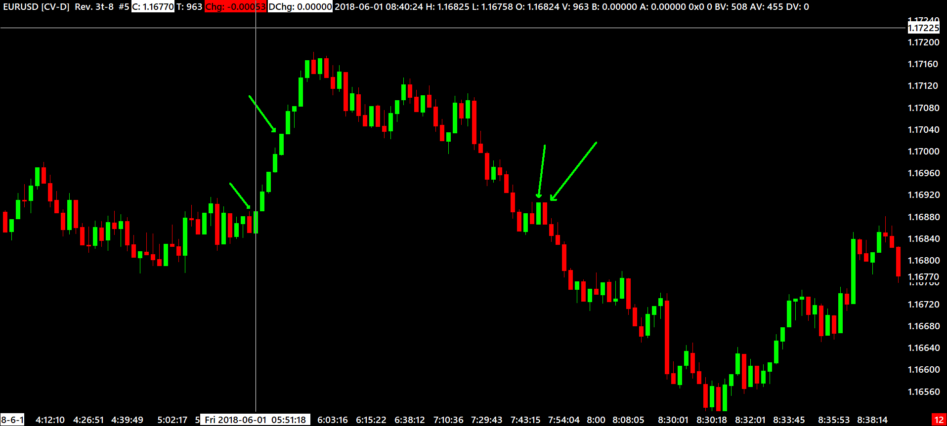 Thank you for your reply regarding why some of the reversal bars do not have wicks. I have made sure that "Tick by Tick" is selected on all my instruments, and I have tried to read thru the Reversal Bar documentation to see if there was something I was not understanding; but I still have candles with no wicks on my reversal charts. This happens on all instruments regardless of the time of day. I have attached 2 images of charts with Reversal Bar settings. 1 chart is of oil, and one chart is the Euro Futures and as you can see I have candles with no wicks...and I was just wondering how and why that could happen if, by definition, there needed to be a reversal before the next candle formed? But this happens on all instruments when I put on Reversal Bars. Thank you http://www.sierrachart.com/image.php?Image=1527961594945.png http://www.sierrachart.com/image.php?Image=1527961709136.png |