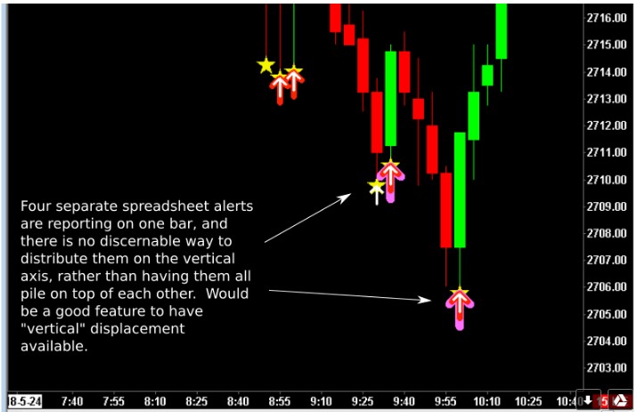 You can do this now as explained here: http://www.sierrachart.com/index.php?page=doc/SpreadsheetSystemsAlertsAndAutomatedTrading.php#ControllingTheLocationOfArrowsOrSubgraphValues Sierra Chart Support - Engineering Level Your definitive source for support. Other responses are from users. Try to keep your questions brief and to the point. Be aware of support policy: https://www.sierrachart.com/index.php?l=PostingInformation.php#GeneralInformation For the most reliable, advanced, and zero cost futures order routing, *change* to the Teton service: Sierra Chart Teton Futures Order Routing Date Time Of Last Edit: 2018-05-25 18:51:00