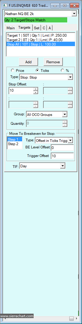 Also make sure this option is disabled: http://www.sierrachart.com/index.php?page=doc/GlobalTradeSettings.html#UseServerSideBracketOrders It might be the cause of the problem which we would have no control over. And be sure to read the prior post. We are also doing some testing now. Sierra Chart Support - Engineering Level Your definitive source for support. Other responses are from users. Try to keep your questions brief and to the point. Be aware of support policy: https://www.sierrachart.com/index.php?l=PostingInformation.php#GeneralInformation For the most reliable, advanced, and zero cost futures order routing, *change* to the Teton service: Sierra Chart Teton Futures Order Routing Date Time Of Last Edit: 2018-05-31 06:31:39