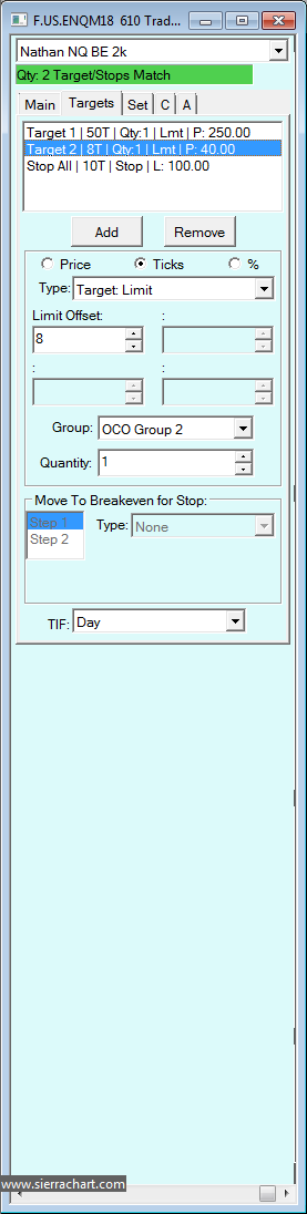 Thanks for the response. After a few additional hours of troubleshooting I figured it out: The first target (further away) was assigned to OCO group 1 and the second target (closer) was assigned OCO group 2. I simply reversed things so that OCO group 1 was assigned to the closer target and OCO group 2 was assigned to the more distant target. The problem existed because: Although add-ons were added to the closer TARGET the STOPS for the add-ons were added for the second target. Hence when the first target was hit, all add-ons were covered but excess buy/sell stops were left over. And when the final target was hit the excess buy/sell stops remained -- and could be filled if price reversed (not cool). I don't know if this would be considered a bug or a misconfiguration on my end. Here's the steps to reproduce, if it helps: STEPS TO REPRODUCE ------------------- 1 - Create target 1 at 50 ticks away and assign to OCO Group 2 2 - Create target 2 at 10 ticks away and assign to OCO Group 1 3 - Create a 10 tick "stop: stop" assigned to "all OCO Groups" 4 - Save config 5 - Enter long and quickly add on 6 - First target is assigned 3 contracts and second target is assigned 1 contract 7 - ?? > First target is reached but 3 sell stops remain. EXPECTED > 1 sell stop remains 8 - Second target is reached and 2 sell stops remain 9 - Price reverses and sell stops are filled |
