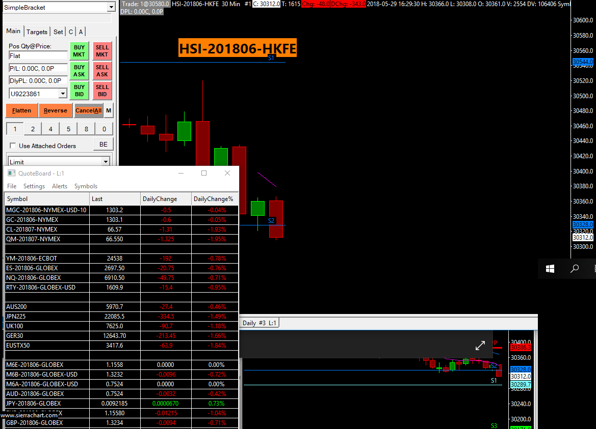 Hello, I have set rollover in HSI-201805-HKFE futures and now I want to have a chat on HSI-201806-HKFE. I couldn't download any data before 2018-05-29 11:54:35 no matter I did the scid files, unchecked the Automatically Rollover Futures Symbol and Continuous Contract to NONE. Please help or any indication on it. Thanks. http://www.sierrachart.com/image.php?Image=1527583969686.png thanks. Regards, techomhk |