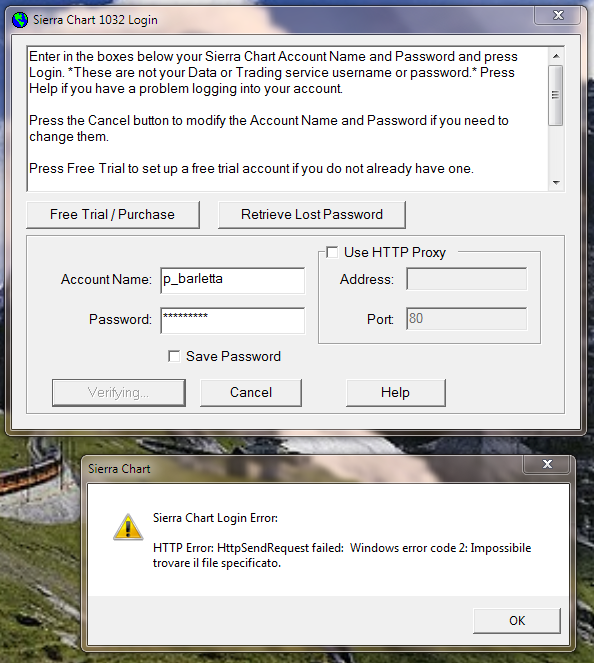 Most likely this is due to Internet Explorer set to be working off-line. Refer to the instructions here: https://www.sierrachart.com/index.php?l=doc/LoginInstructions.php#LoginProblems Sierra Chart Support - Engineering Level Your definitive source for support. Other responses are from users. Try to keep your questions brief and to the point. Be aware of support policy: https://www.sierrachart.com/index.php?l=PostingInformation.php#GeneralInformation For the most reliable, advanced, and zero cost futures order routing, *change* to the Teton service: Sierra Chart Teton Futures Order Routing Date Time Of Last Edit: 2013-10-11 15:56:29