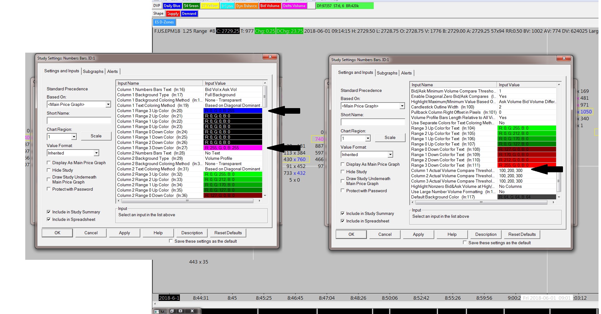 Hi, I attached a screenshot (the 1st one))that shows the setting being used in the Numbers Bar Study using 1.25 Range bars. In the Numbers bar Study, the setting I only what to show the highest BidxAsk (In.20 & In.27) set to 3 times (In.112) on the way UP and the highest AskxBid on the way DOWN. On the 2nd screenshot, the Black arrows shows numbers that should NOT be highlighted and the Red arrows shows numbers that Should be highlighted. I have been struggling with this for 3-4 days and just not making an progress. Also, I set the "Pullback Column Right Offset in Pixels" (In.101) to "50". When the next bars opens, only half of the pullback Column is displayed. Regard, Daniel |