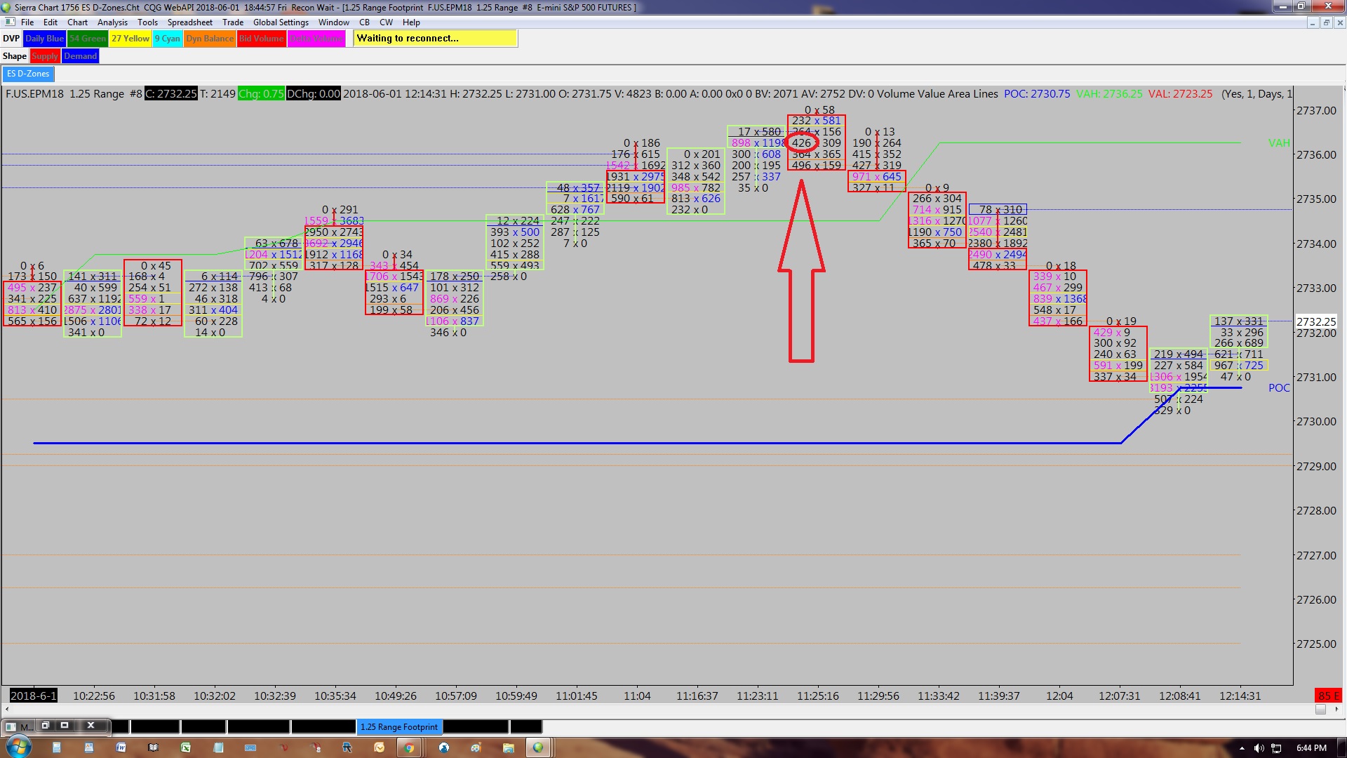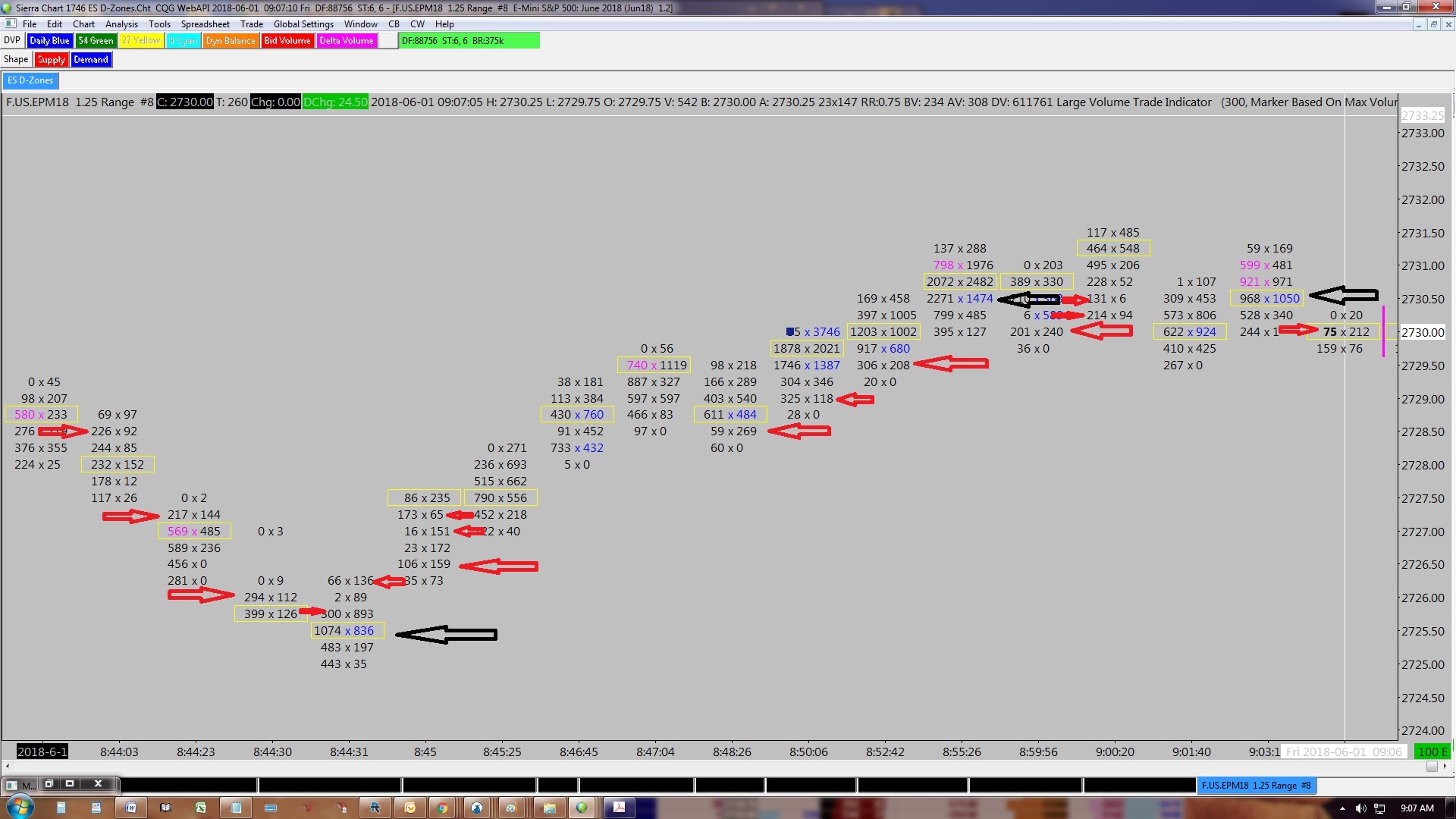 Ok, I think it is simply idea but maybe not so simple to implement On a ES chart. Using a 5 range bar chart. Condition: The previous bar closed down. Then on the next bar, (up bar) the ASK volume is 3 times greater that the bid volume, the ask text colour will be highlighted BLUE. The reverse for an BID colour. The previous bar closed up. Then on the next bar, (down bar) the bid volume is 3 times greater that the ask volume, the bid text colour will be highlighted RED. I would like to put this together with a condition: that this will only occur - if the range bar CROSSFROMABOVE the daily VAL for a blue text highlight and - if the range bar CROSSFROMBELOW the daily VAH for a RED text highlight I hope this makes sense. I attached a screenshot for a reverse for an BID colour. The previous bar closed up. Then on the next bar, (down bar) the bid volume is 3 times greater that the ask volume, the bid text colour will be highlighted RED. Regards, Daniel Date Time Of Last Edit: 2018-06-02 00:48:10