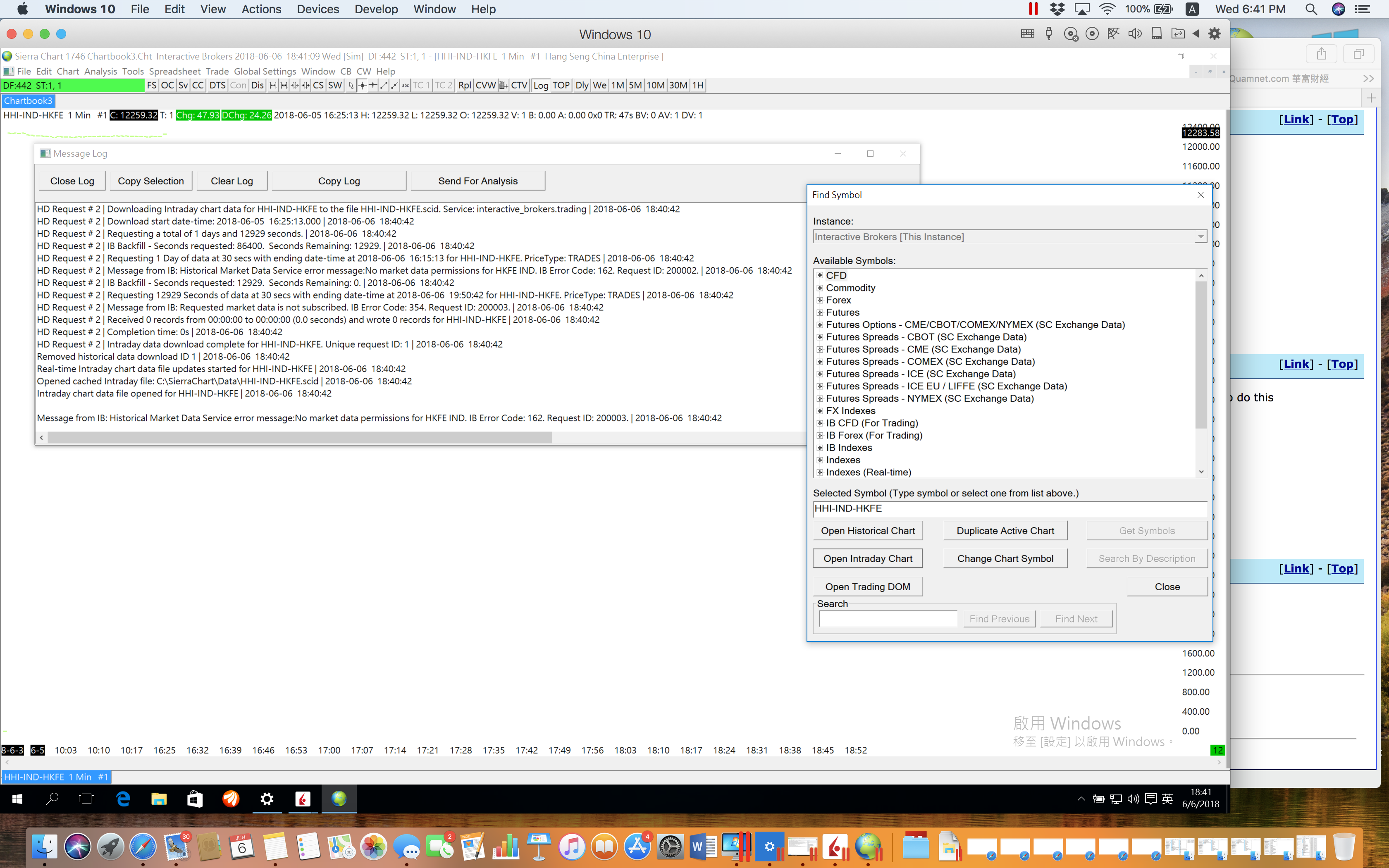 This is the reason for the problem: Message from IB: Requested market data is not subscribed.Delayed market data is not available.HHI.HK Hang Seng China Enterprise Index/TOP/ALL. IB Error Code: 354. Request ID: 1. Symbol: HHI-IND-HKFE. HD Request # 2 | Message from IB: Historical Market Data Service error message:No market data permissions for HKFE IND. IB Error Code: 162. Request ID: 200002. Refer to: Interactive Brokers Trading Service: Market Data Not Subscribed Through Interactive Brokers Sierra Chart Support - Engineering Level Your definitive source for support. Other responses are from users. Try to keep your questions brief and to the point. Be aware of support policy: https://www.sierrachart.com/index.php?l=PostingInformation.php#GeneralInformation For the most reliable, advanced, and zero cost futures order routing, *change* to the Teton service: Sierra Chart Teton Futures Order Routing Date Time Of Last Edit: 2018-06-06 20:31:06